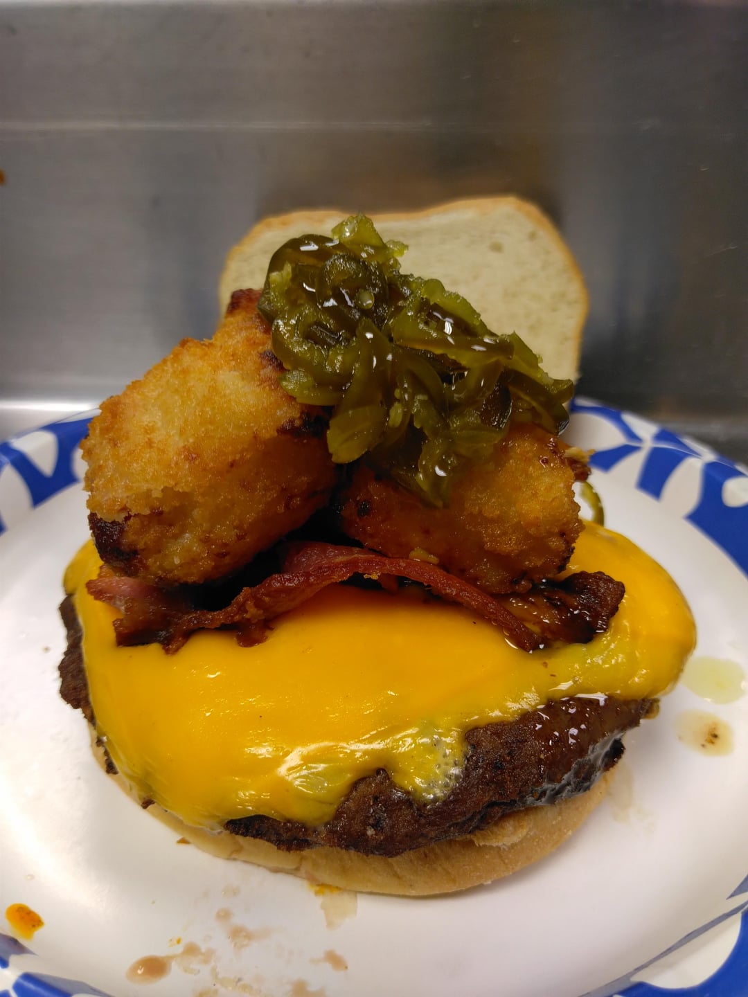 Bacon cheeseburger topped with fried Mac n cheese bites and pickled jalapeno relish