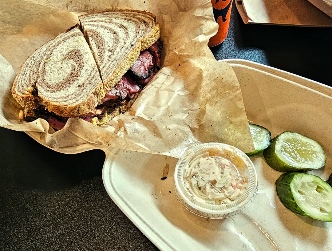 Over 1LB of pastrami with deli mustard and a side of coleslaw and pickles, one of my favorite sandwiches in Seattle.
