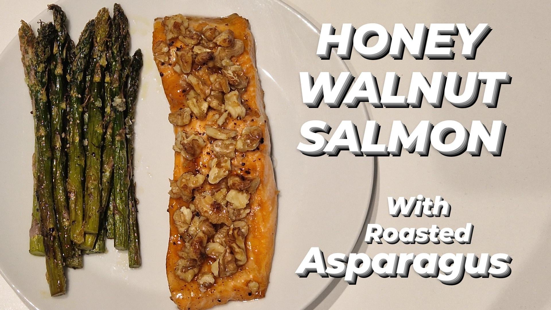 Turn the oven to 220C (430F) Seson the asparagus and lay them out in a single layer on a baking sheet. roast for 5-6 minutes. Take out the baking sheet and place the salmon filets next to the asparagus. Rub the salmon with soy sauce. Lightly season with salt and pepper. Crush walnuts onto the salmon. drizzle with honey. Place the baking sheet back in the oven and roast for about 10 minuts.