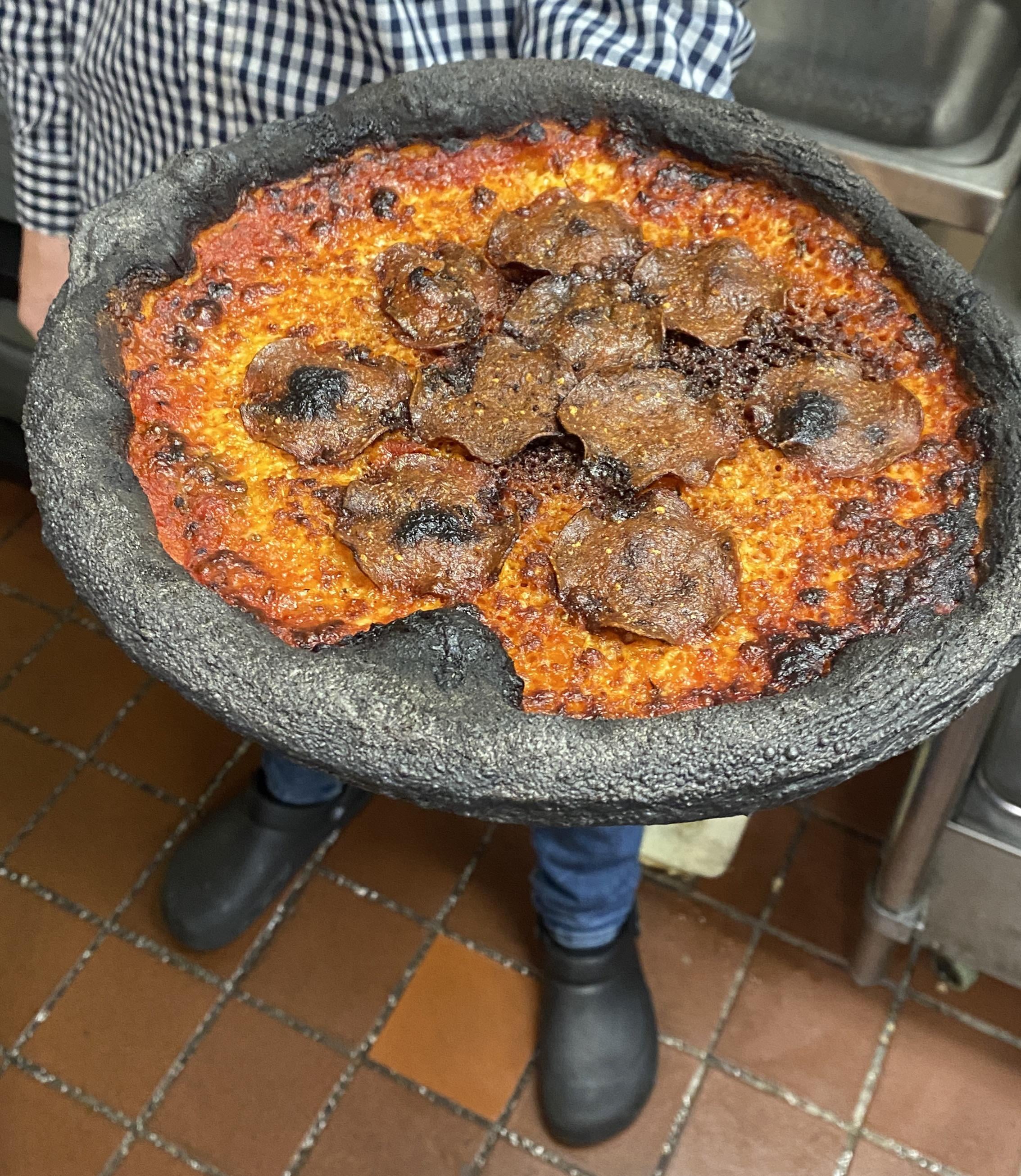 I get it because the cheese product is slightly charred while the base is incinerated and the meat is fossilized.
