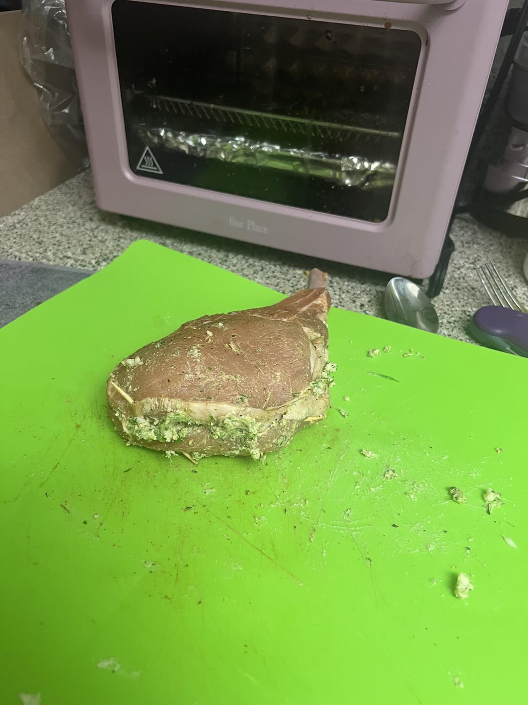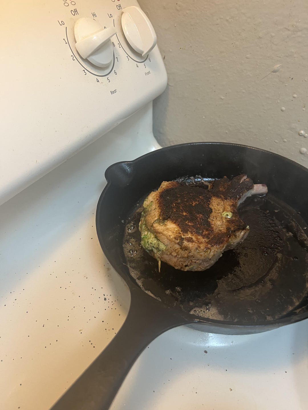 Pork chop stuffed with goat cheese and blanched broccolini