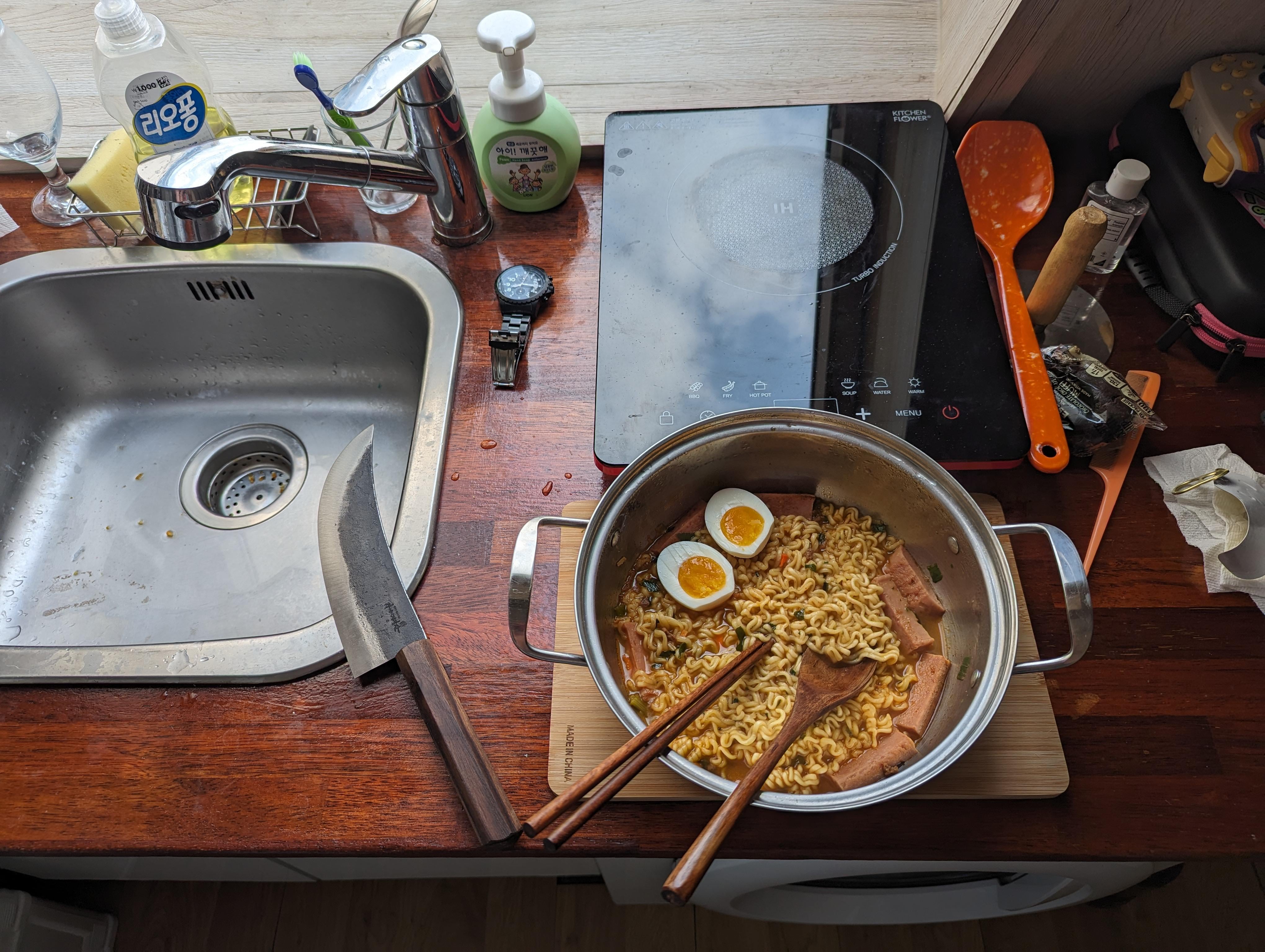 3 days left in Korea, and another noodle breakfast with egg and fried spam from emart24.in my tiny apartment kitchen/bathroom😀