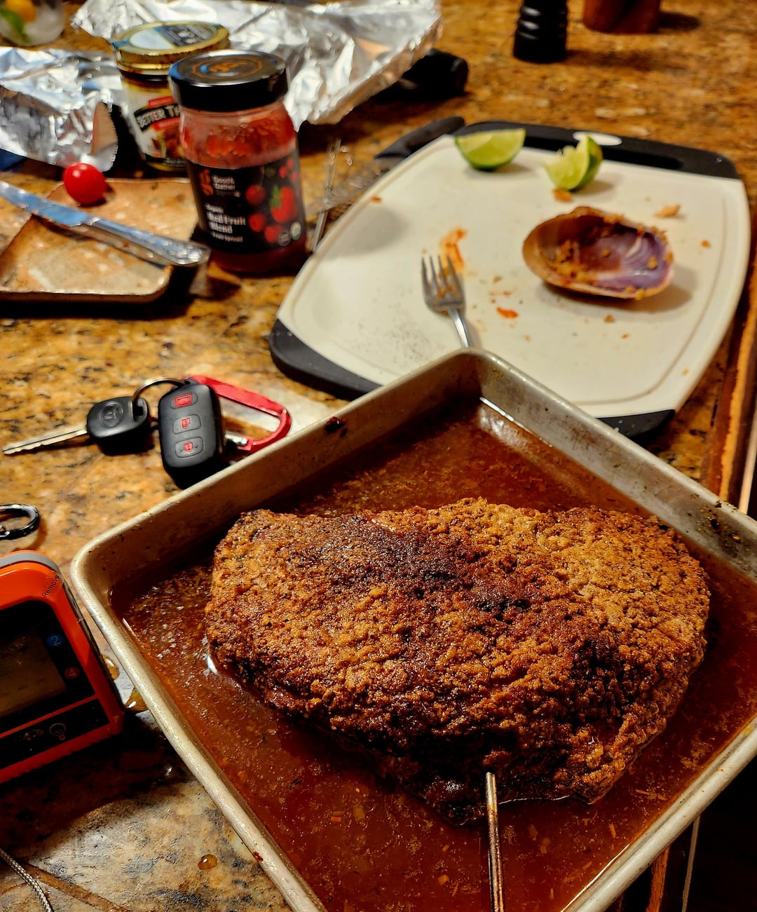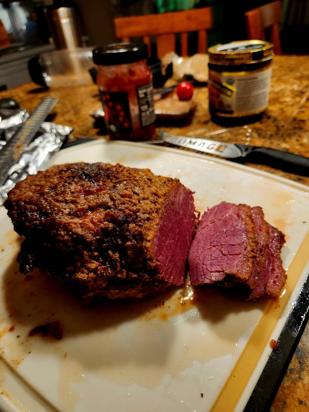Juiciest Corned beef I have ever made, with a really nice smoky flavor. Not 100% sure it was worth smoking for 4 hours, and then braising for 2 more, but I have some tasty sandwiches coming up, and some epic corned beef hash to look forward to on Saturday.