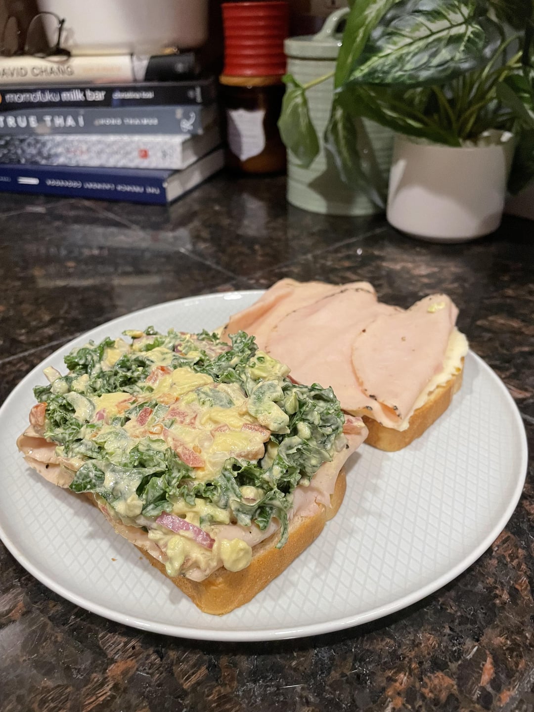 (Avocado, kale, tomato, red onion, jalapeño, Dijon mustard and mayo, jalapeño cheddar jack cheese, peppered turkey on untoasted sourdough)