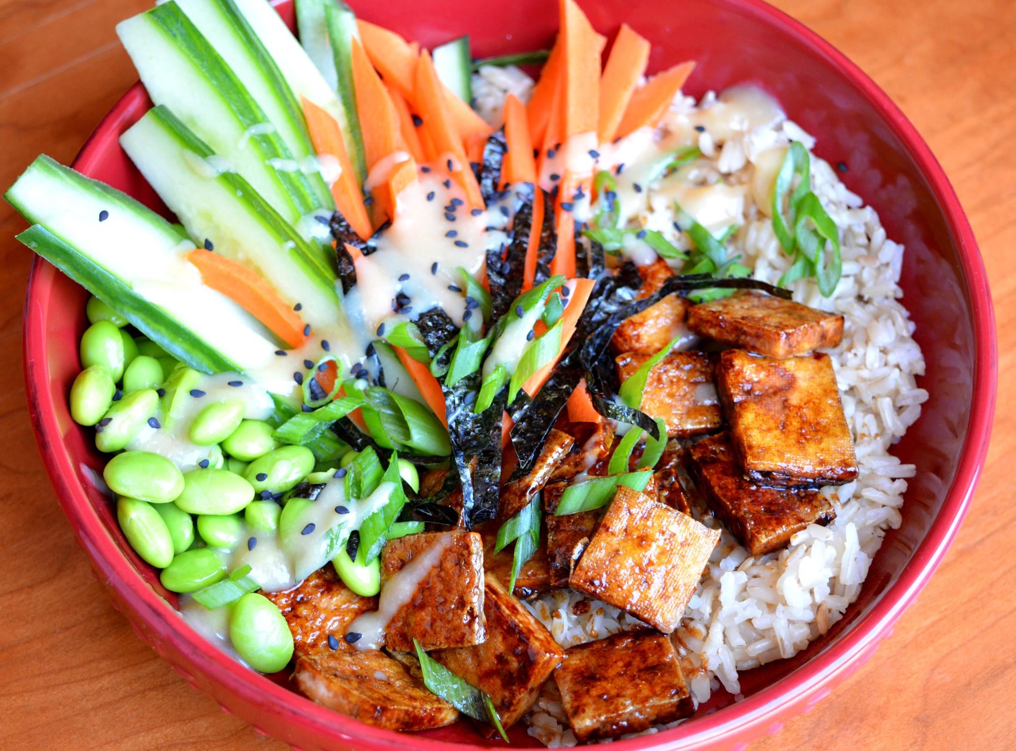 BeccaJ9382 2 years ago miso ginger dressing: 1 T miso paste + 1 tsp raw ginger and rice vinegar, sweetener to tastetofu: pan fried tofu (1/4 box, extra firm) with 1 T of Bachan’s Japanese Barbecue sauce and 1 tsp of dark soy sauceEverything else: .5 c of steamed brown rice, 37 g carrots, 87 g cucumber, 50 g edamame