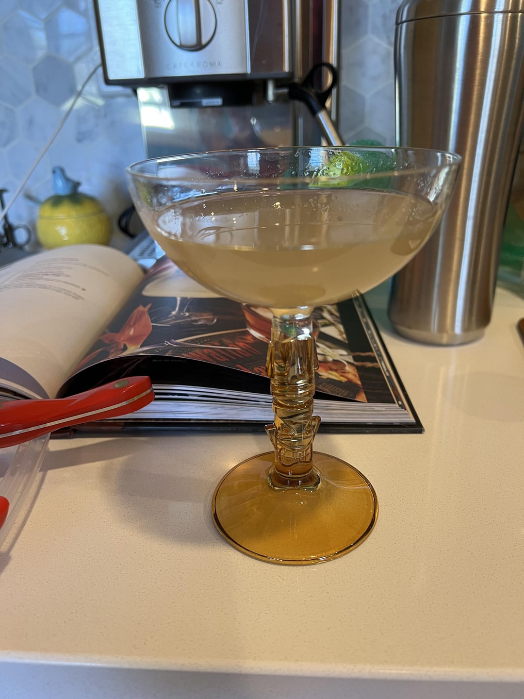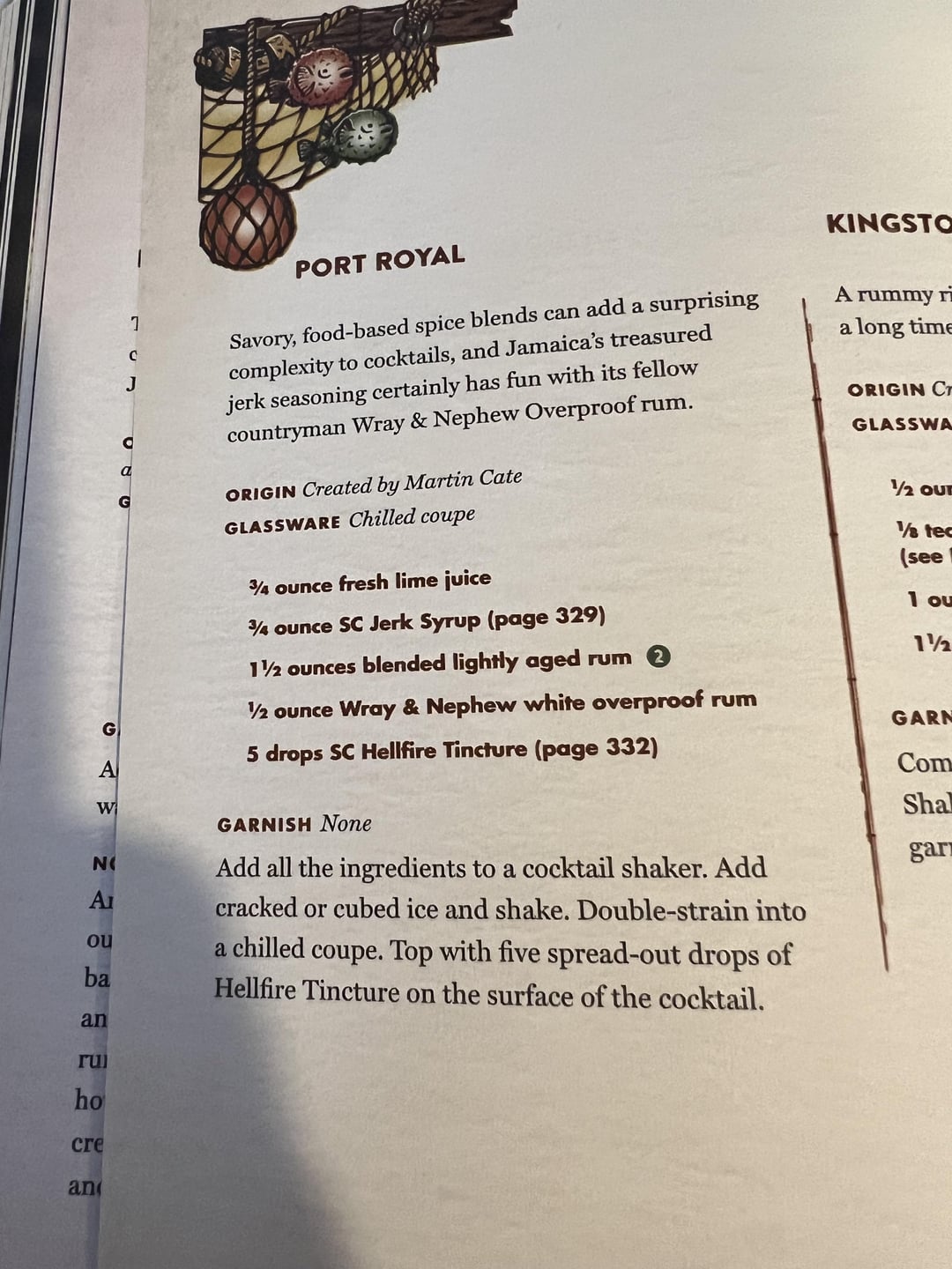 It has simple syrup made with jerk seasoning and 5 drops of "Hellfire Tincture", which is 2 cups of habaneros, jalapenos and seranos cooked down in white wine and soaked in brandy for 2 weeks.
