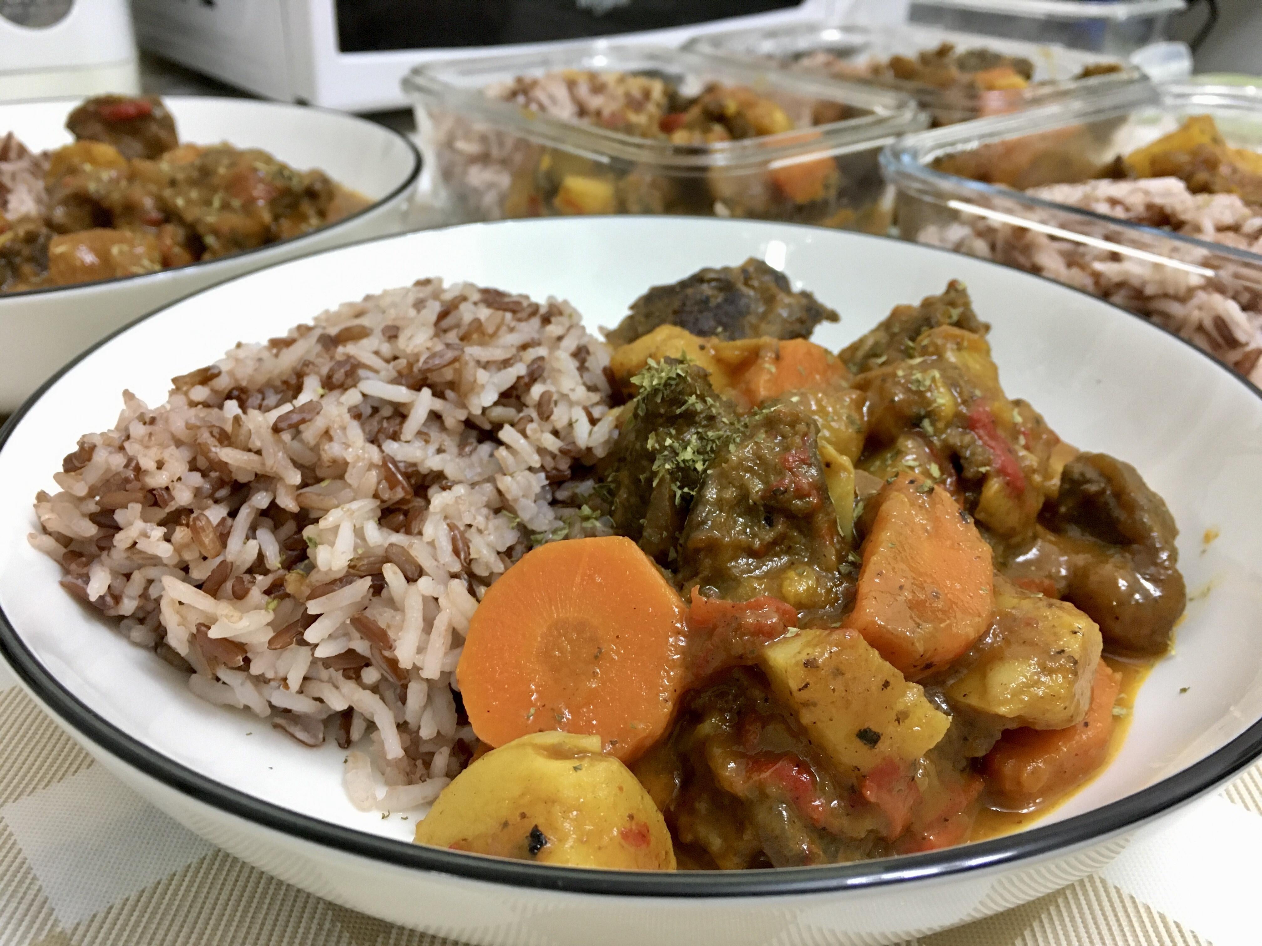 1. Cut and wash vegetables. Cube up the beef, and rub with salt and pepper. 2. Put a pan on high heat with a bit of vegetable oil. Sear the beef in batches and reserve. 3. Add aromatic vegetables and stir, until they pick up a bit of colour and wilt a bit. 4. Add tomato paste and stir into the vegetables. Return the beef, along with the goulash cream, and add water to cover. 5. Add Better than Bouillon, stir to dissolve, bring stew to a simmer and cover. 6. Clean up, do whatever else you want as long as stir the stew every couple of minutes for the next two and a half hours or so. 7. Taste the beef. Once beef is almost tender, wash and cut the root vegetables and add them to the stew. 8. Taste and adjust for seasoning, Let the stew simmer uncovered for another 30 minutes. Make rice in the meantime. 9. Once root vegetables are tender to your liking, assemble and serve with an optional