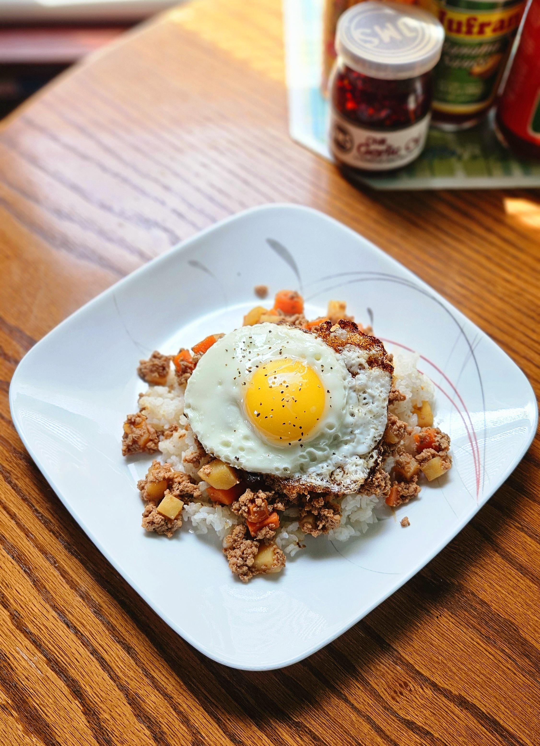 Sunny side egg on Filipino Picadillo over steamed rice.