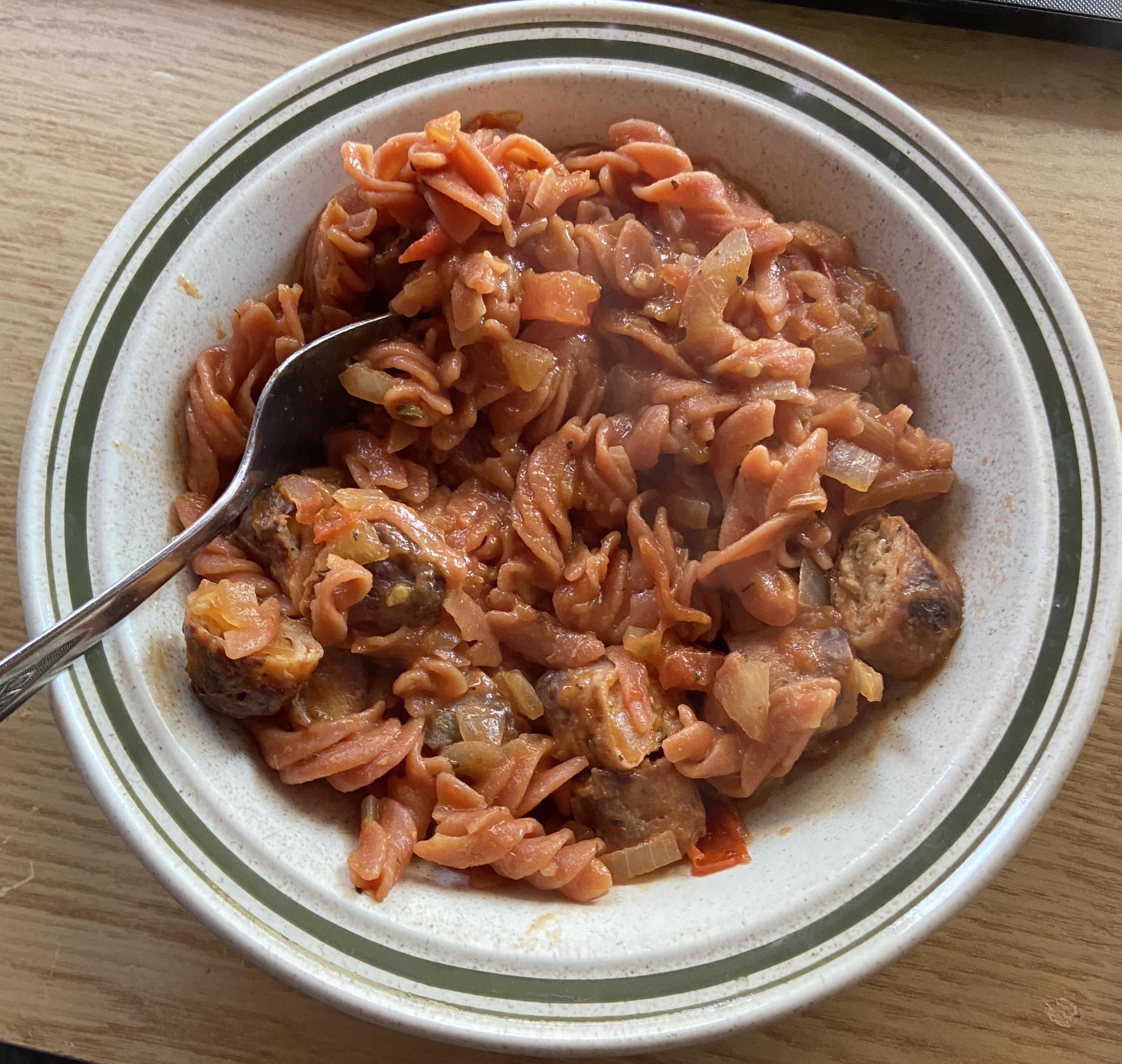 pasta was a majorly overcooked and it looks a bit dodgy but it was vv comforting ! ask for recipe ! (literally consists of like 6 ingredients) by among_flowers 1 Comment among_flowers 2 years ago oops didnt realise posting the recipe was a rule:1 tomato (i use vine ripened) 1/2 onion, red or brown dried mixed herbs (measure w ur heart) 1/2 clove garlic/granules/pureé 100ml ish pasta water2 aldi tomato and basil chicken sausagesfry the onion in olive oil until a little browned, then add the tomato, garlic and herbs. cook down for around 7 minutes. add pasta water.i grilled the sausages in 5 min intervals, turning them over each time.Write A CommentYou must be logged in to post a comment.
