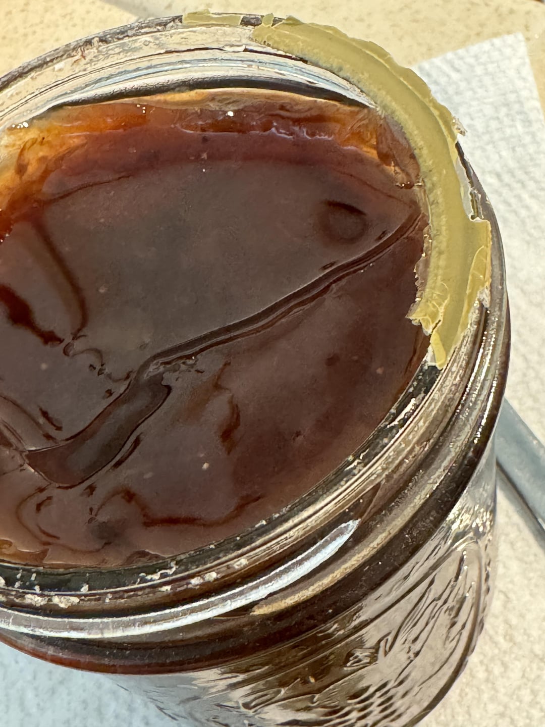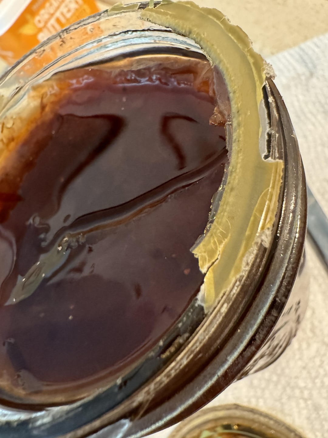 I know very little about canning. My MIL sent me this jar of plum jam she made. It was really hard to get the flat part of the lid off but once I did, there is some sort of substance on the mouth of the jar. It almost looks like a seal or gasket melted? Should I just toss it?