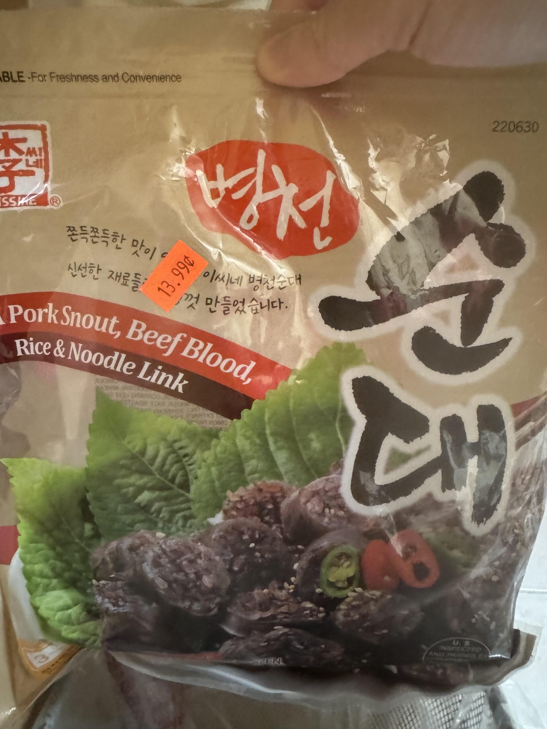 I’ve been currently in a soondae mood and my local Korean mart wasn’t selling any fresh ones so I tried this frozen one and it was not good. I prefer the variation with mostly springy noodles and less blood chunks if that makes sense.
