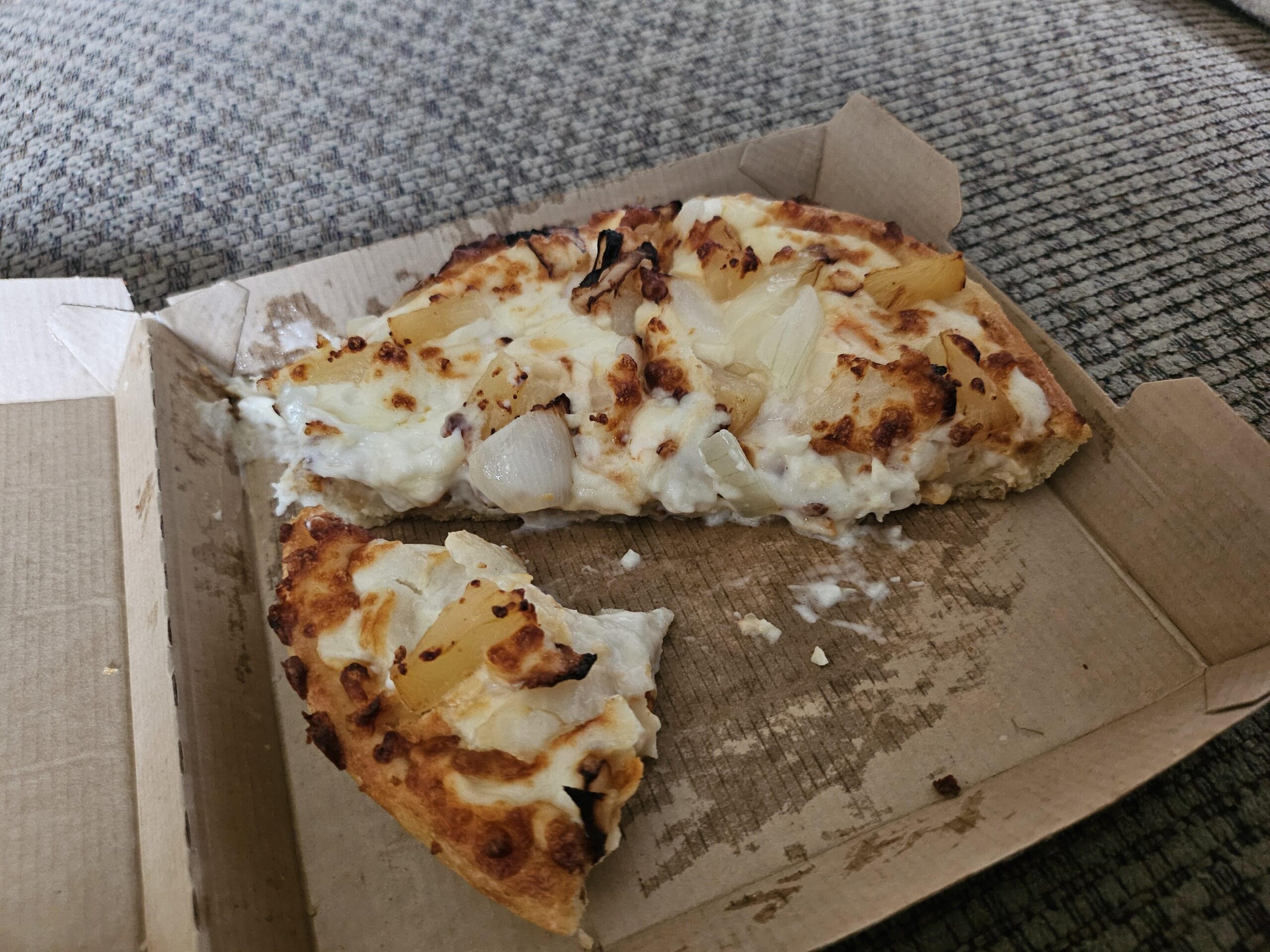 Those cuts of onion are gigantic. I like onions and pineapple on pizza but never an entire mouthful of onion while eating a single bite of pizza. No.