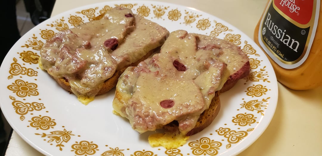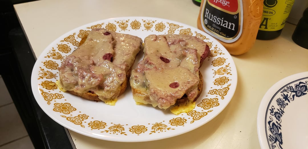 Rye bread, Mike's Amazing Deli Mustard, fresh cooked corned beef done in the slow cooker, melted Swiss eaten with a drizzle of Russian dressing. Didn't have any sauerkrout on hand otherwise we would have gone full Reubens.