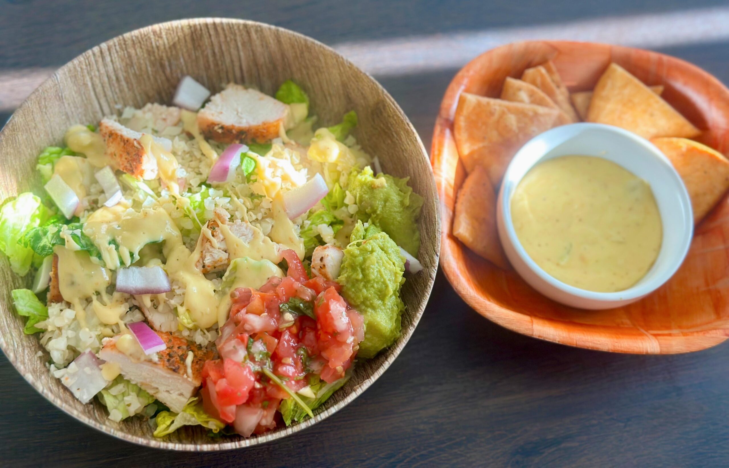 Bake 1 chicken breast in the oven until fully cooked. I cut mine into small pieces afterwards. Layer on top of 1c romaine lettuce, 1/2c of cauliflower rice (I cooked mine with cilantro, salt and a drizzle of lime juice). Layer about 1/2c more lettuce, another 1/2c up the rice, top with the rest of the chicken. Also added a few diced onions, a few tsp of pico, 2tbsp of guacamole and drizzled with homemade queso, also on the side with zero carb tortilla chips!