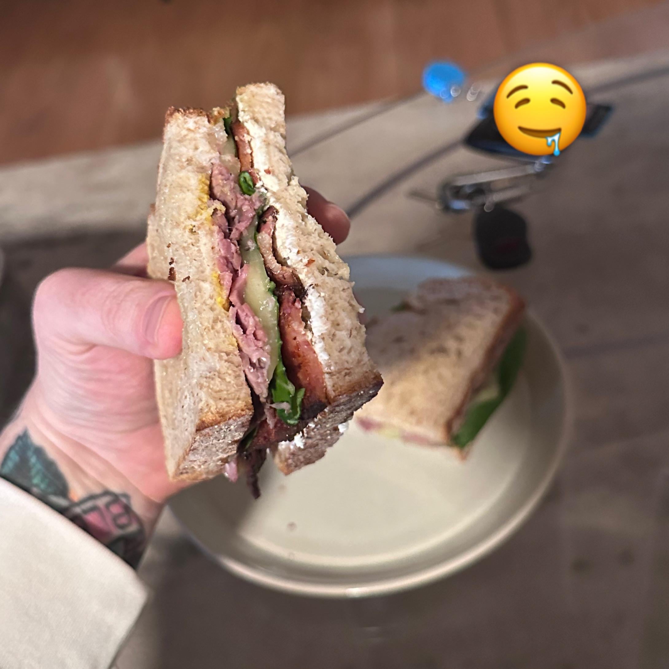 My girlfriend whipped up a banger tonight!Sourdough, light mustard/mayo, roast beef, melted provolone, pickles, basil, bacon, and goat cheese (in that order).by cee_dawg Write A CommentYou must be logged in to post a comment.