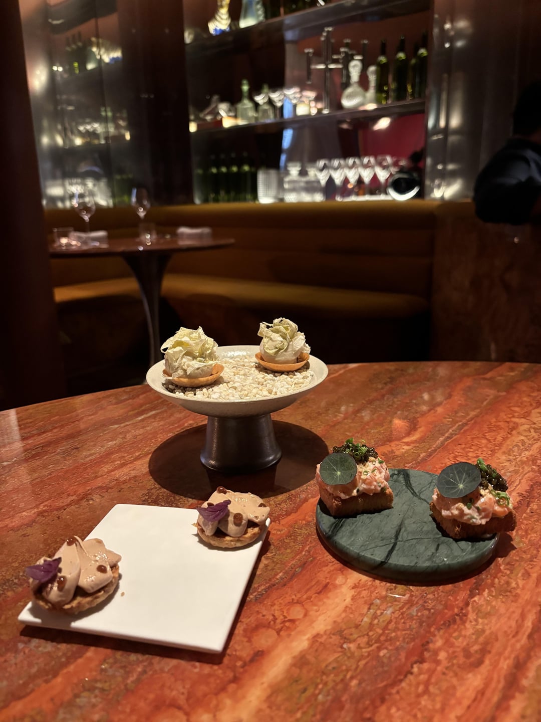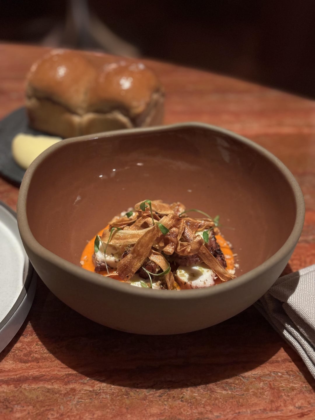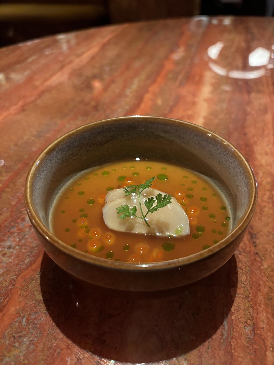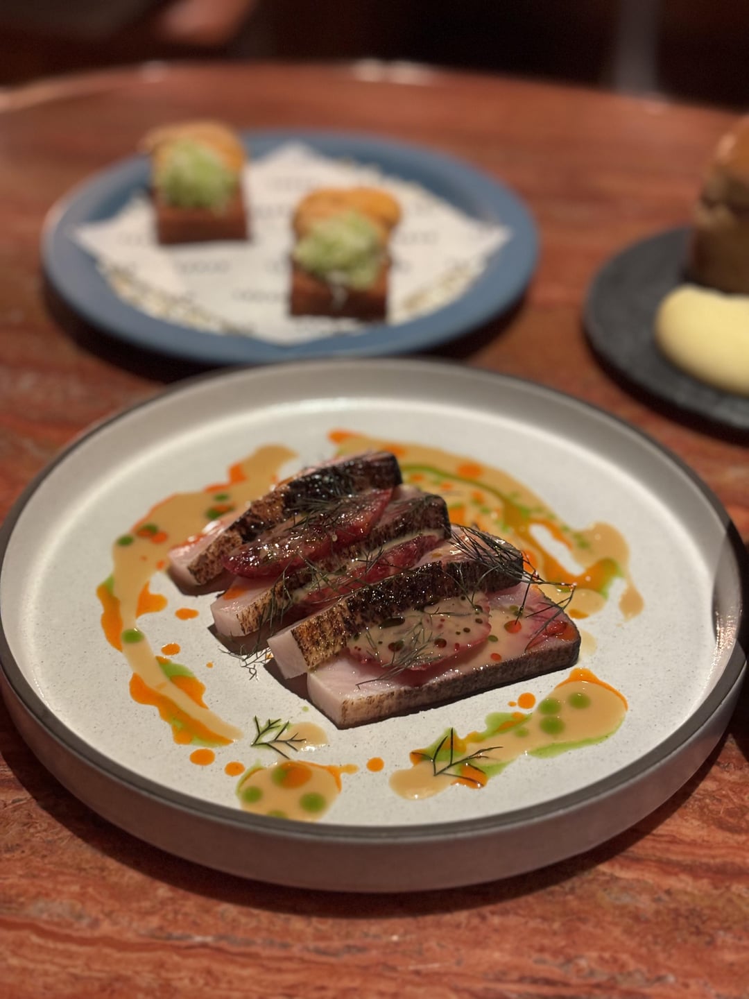 (5) Smoked Kingfish, blood orange. Nice balanced dish with a tad hint of smokiness. Blood orange pairs nicely with the fish as well.