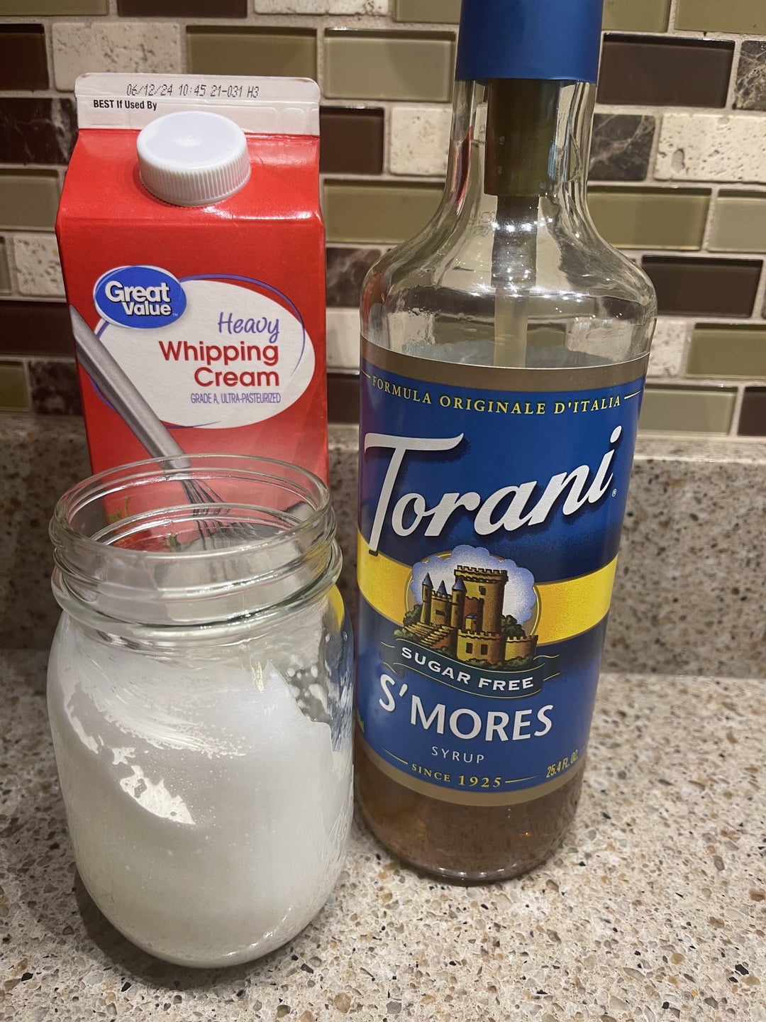 For the whipped cream use 2tbsp heavy whipping cream with half a squirt of Torani sugar free s’mores syrup. Whisk with an electric mixer until peaks form.