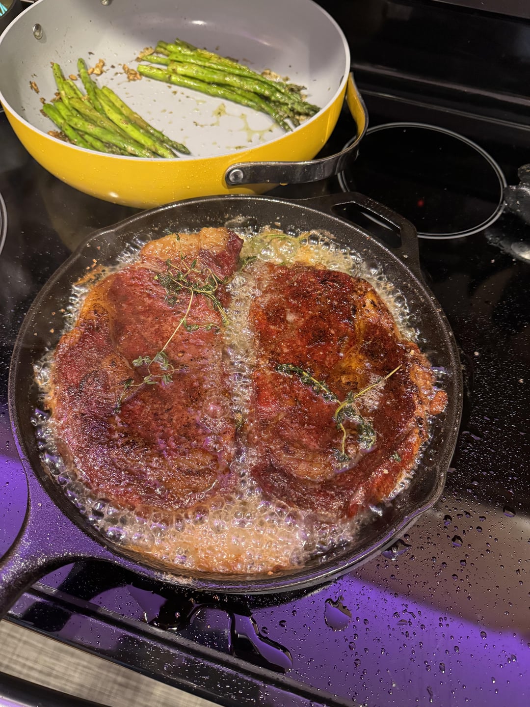 Reverse sear on smoker. Roasted baby potatoes with fresh parsley and thyme. Sautéed asparagus.