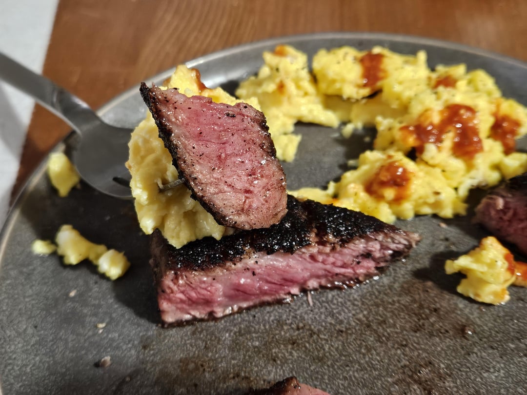 First time making steak and eggs together. I tried flipping the Denver every 1 min, for just under 6 minutes total. Whereas I am usually a flip once kind of guy. This method worked really well, just not sure why the crust is so black, but it tasted better than it looks. Denver cut.