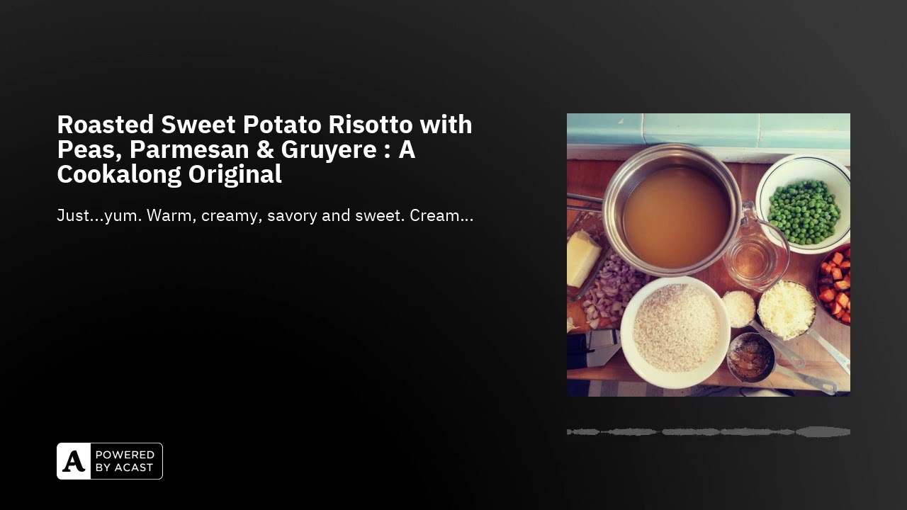 Ingredient list & photos: https://thecookalongpodcast.com/recipe/roasted-sweet-potato-risotto-with-peas-parmesan-gruyere/