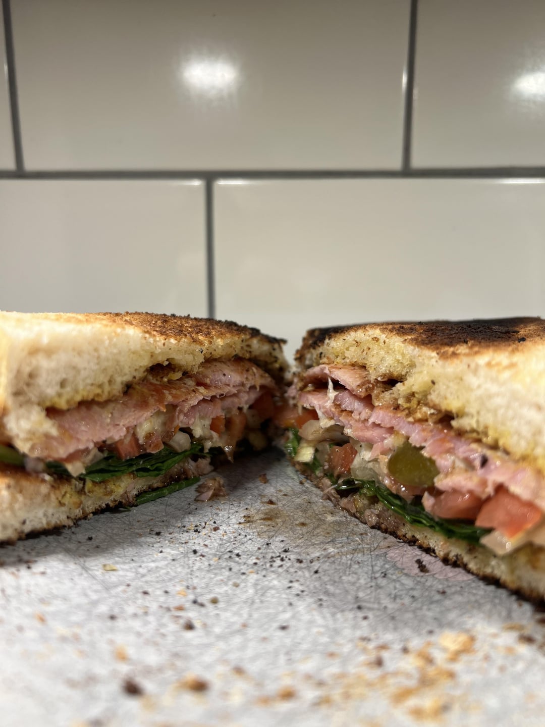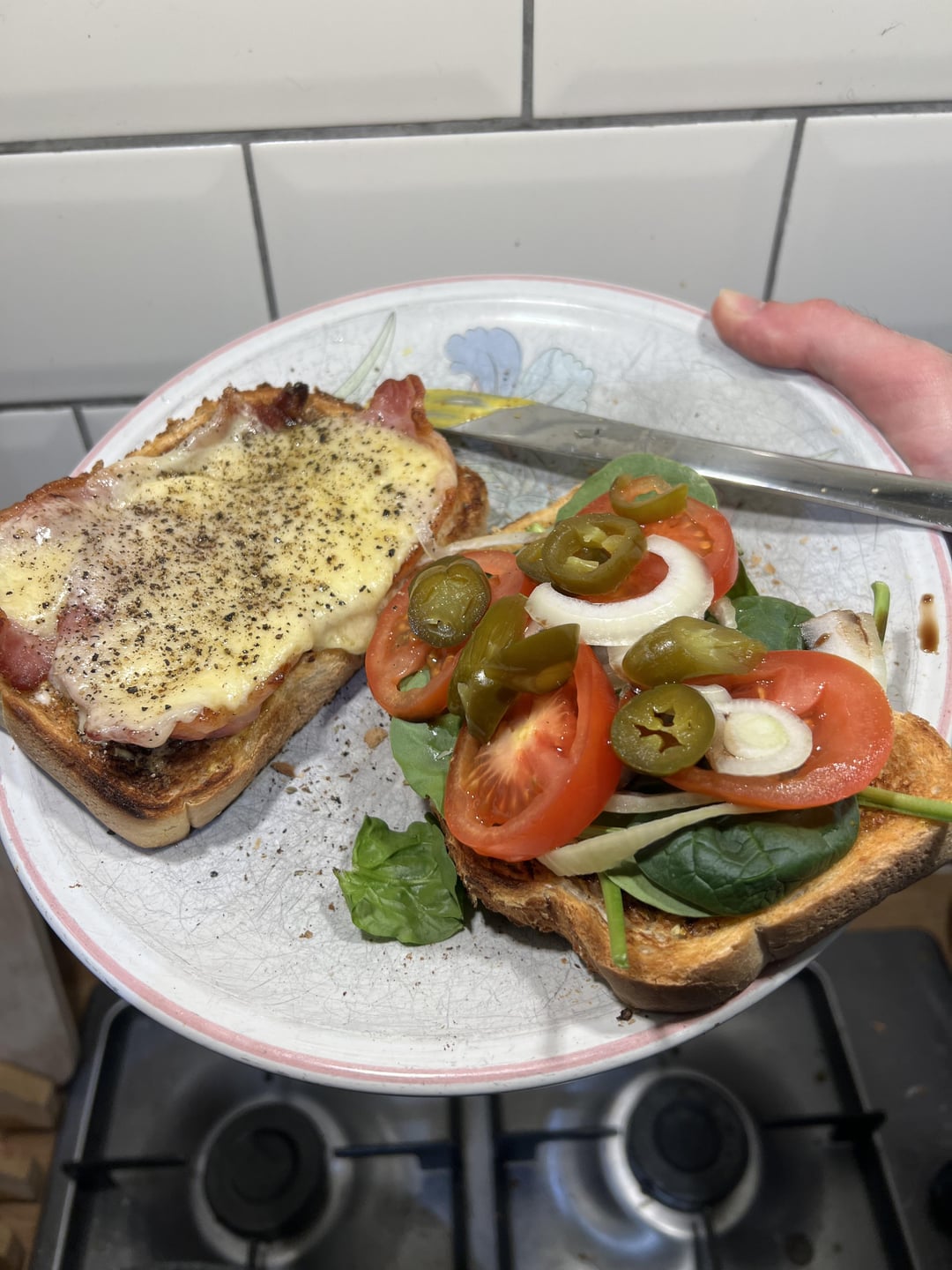 Fried bacon, cheddar, spinach, tomato, onion, jalapeño, with butter, mayo and Coleman’s mustard, along with salt, pepper, oregano and a splash of balsamic