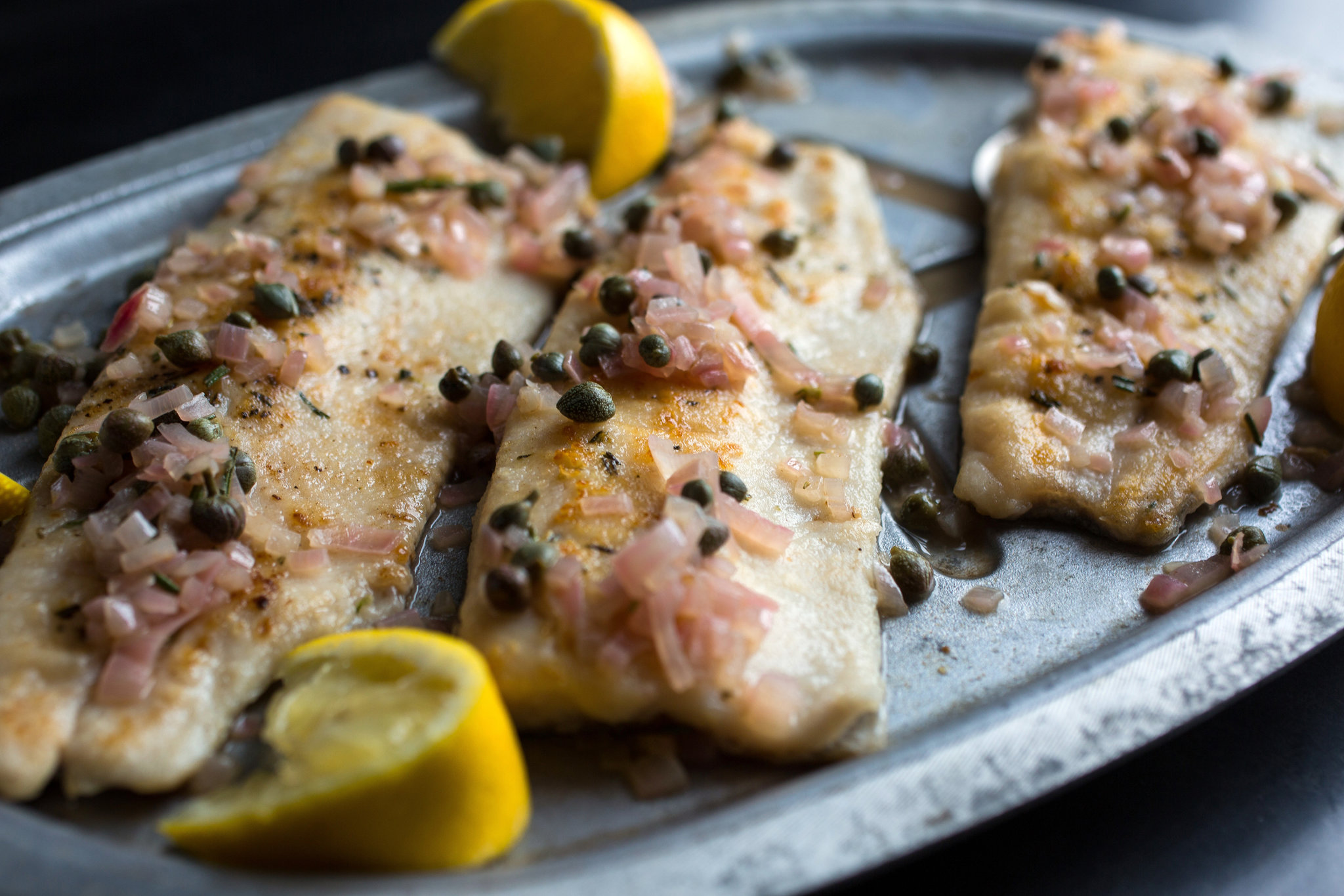 - Pour in the wine and reduce to 1/3 cup, about 5 minutes. Stir in the lemon juice, capers and remaining teaspoon rosemary and remove from the heat. Season with salt and pepper to taste. Place 1 trout fillet on each of 4 plates, spoon the sauce over the trout and serve immediately.