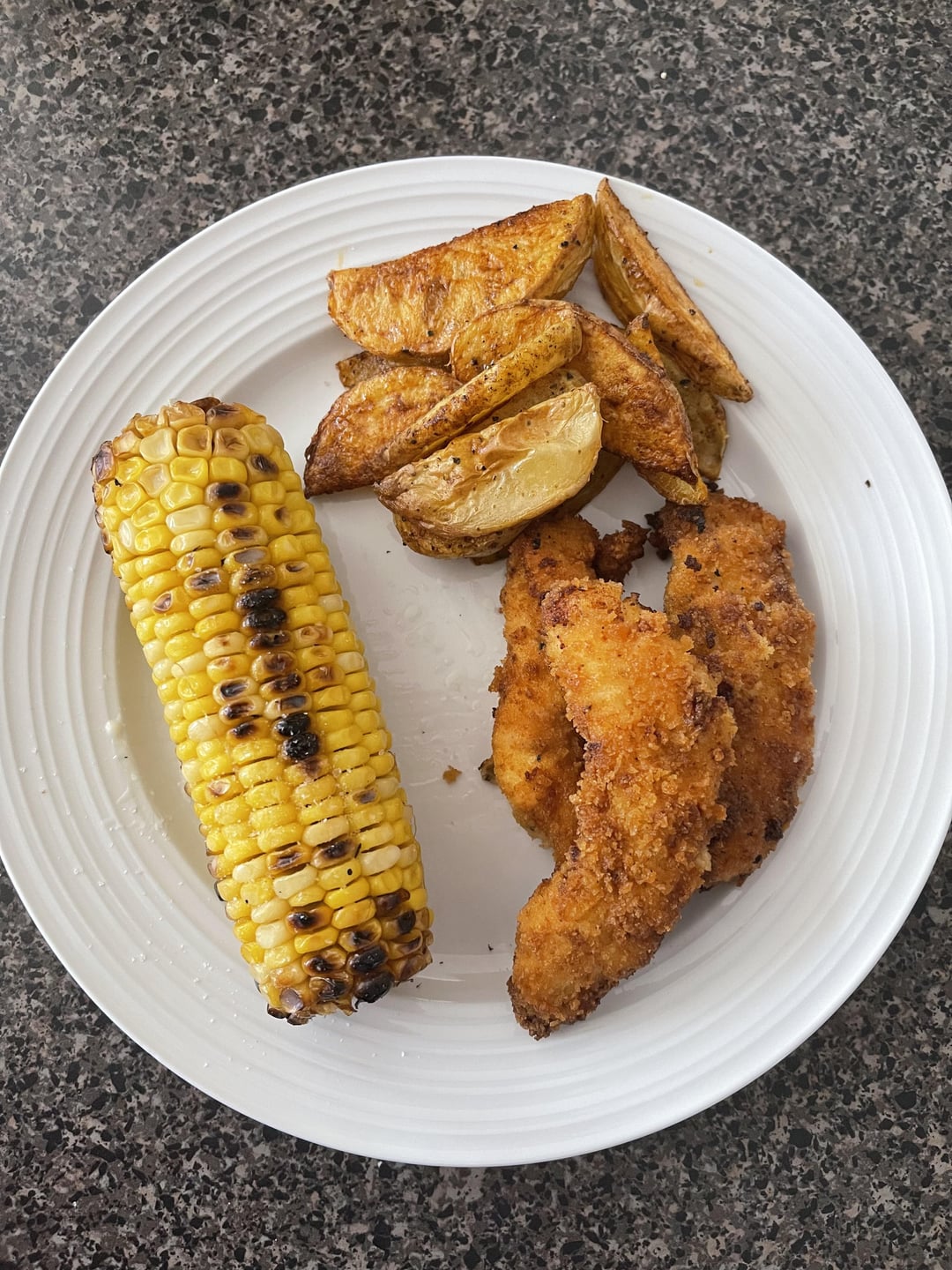 I grilled corn on the cob yesterday and had some leftovers so I just used that instead of the canned corn. Frying the chicken was fast in the fry baby. I really enjoy the fry seasoning on it. I added a little bit of flour to the panko and it kept the coating on better while being fried.