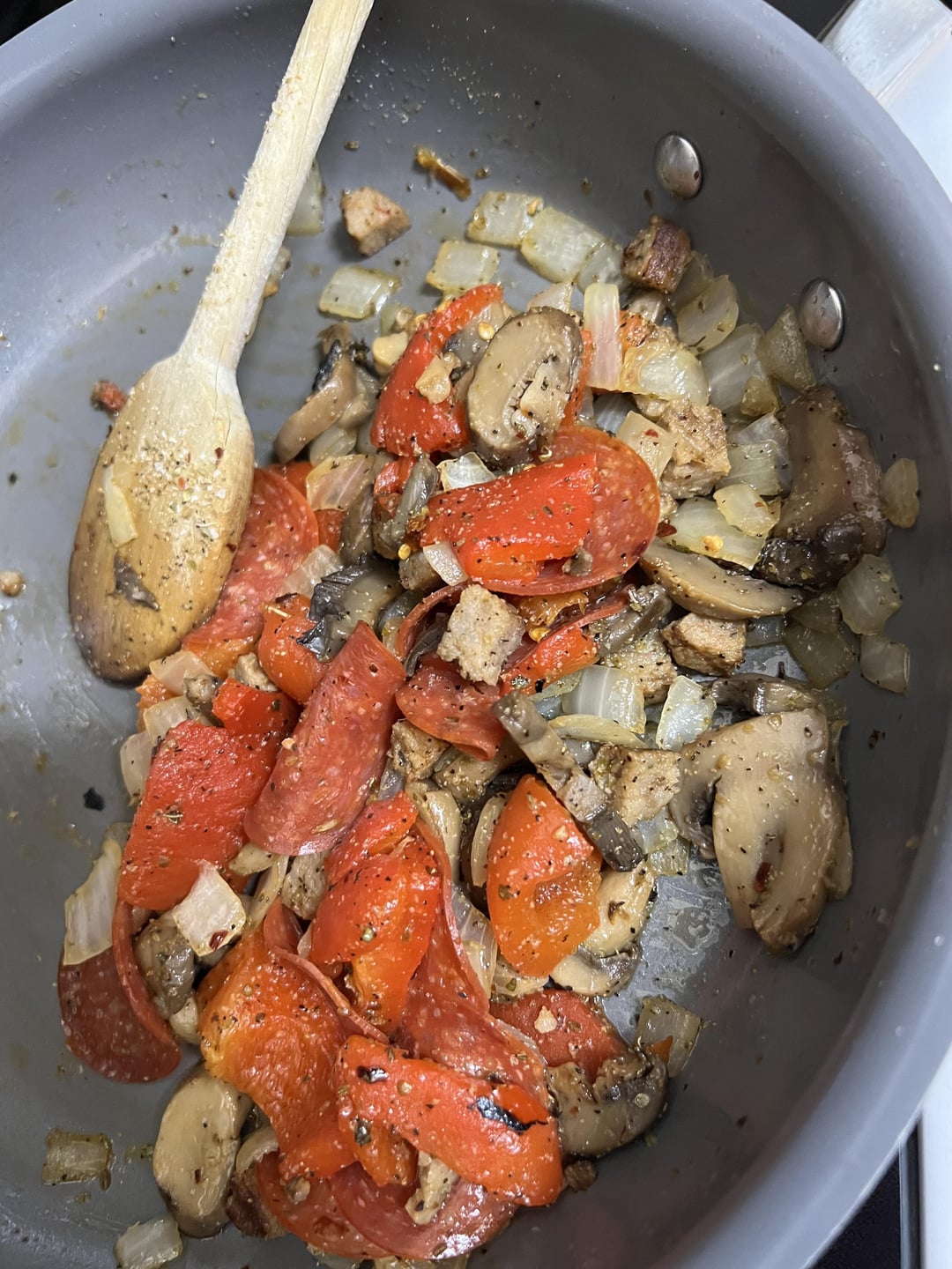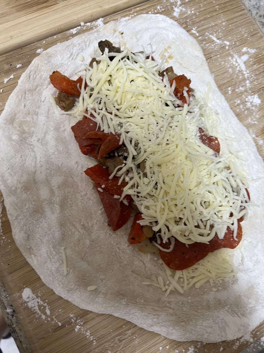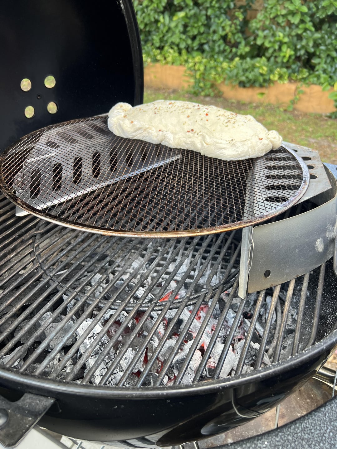 Pizza dough bought from my favorite local pizzeria, easy semi-homemade pizza sauce to dip, a can of Publix organic tomato sauce, spices to your liking nuked it for 30 seconds. Par cooked onions, mushrooms, sausage, roasted red peppers and pepperoni. Mozzarella cheese…..About 10 minutes indirect at pretty high heat 500-ish and then a couple minutes each side to brown it up. Delish!!
