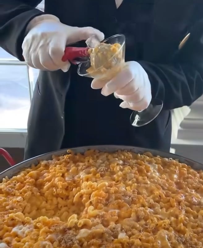 Let me see if I understand this. It’s a fancy catered event complete with servers in white gloves and tuxedos, at least one of whom is using an ice cream scoop to shovel macaroni and cheese into cocktail glasses. Am I missing something?