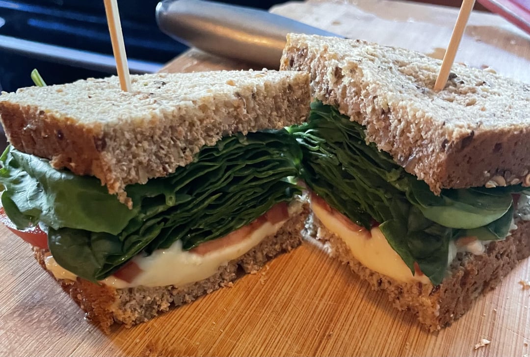 Spinach, basil, tomato, and Brie on multigrain bread. Sometimes I add avocado (it’s good both ways).