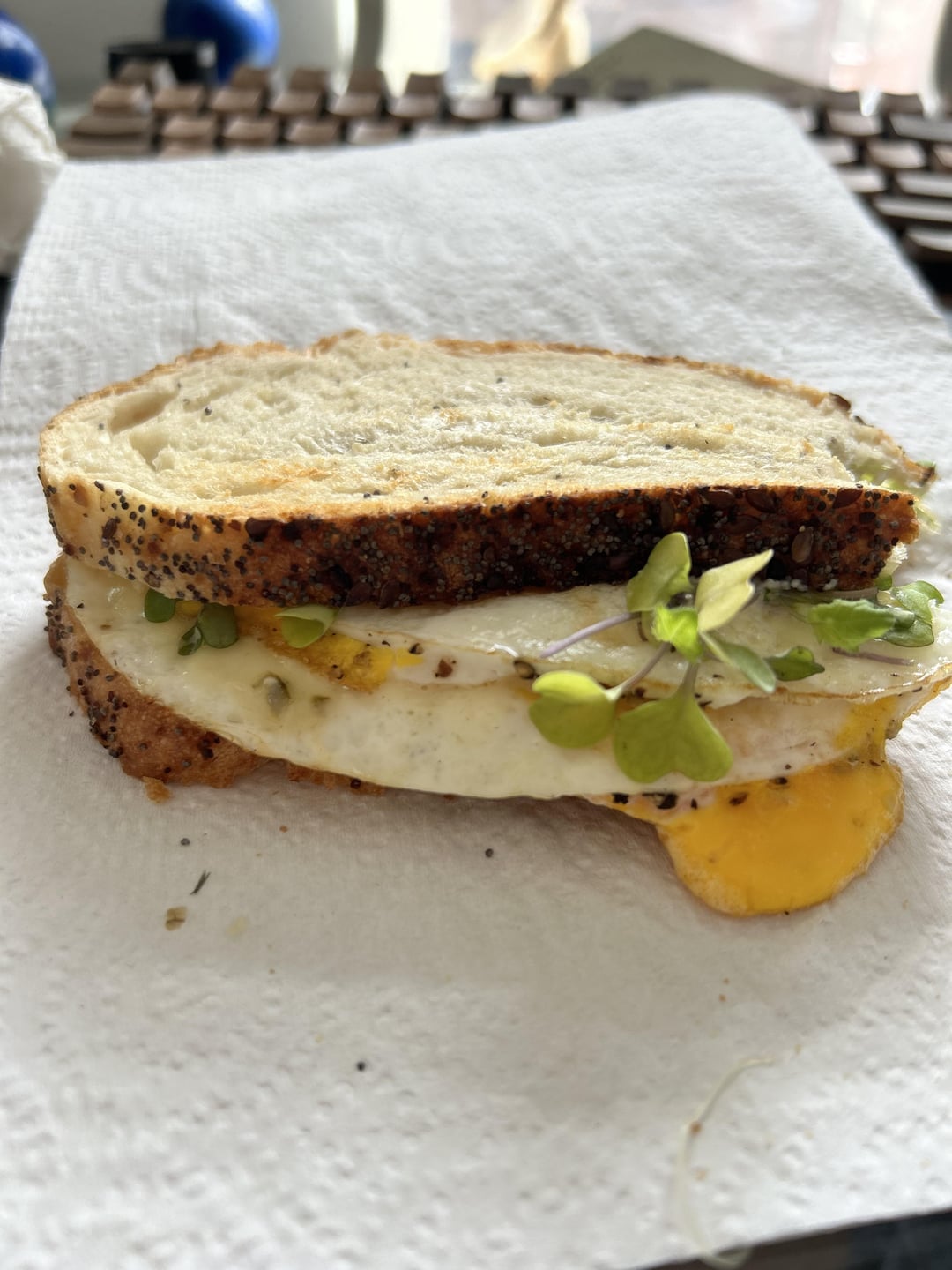 Izzo sourdough bread (honey and oats first photo, everything second), two fried eggs (yolk slightly cooked), cheese of your choice (American in both), avocado spread with seasoning, microgreens (cilantro if available) to bring it all together.