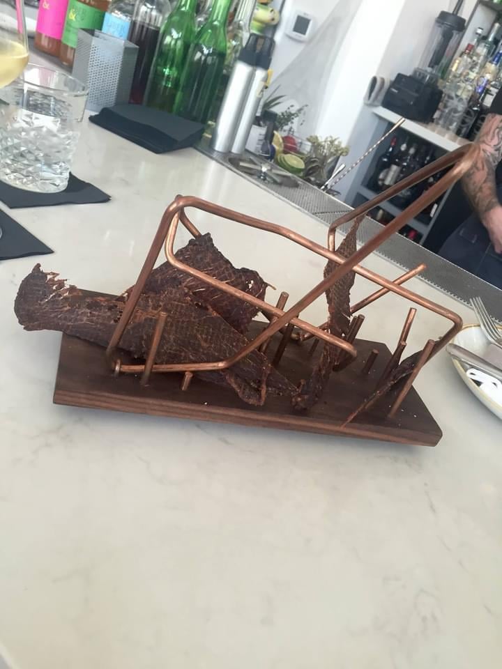 Store bought beef jerky on plank in a crushed basket…. Why?