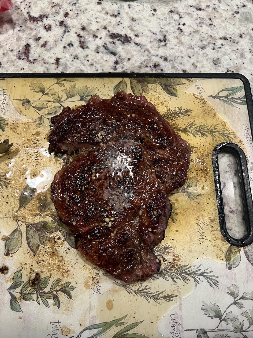 Cooked it on the stove for 2 minutes on one side and about a minute and a half on the other before basting with butter and garlic. Let it rest for about 7-8 minutes before I couldn’t wait any longer. Let me know how I did!