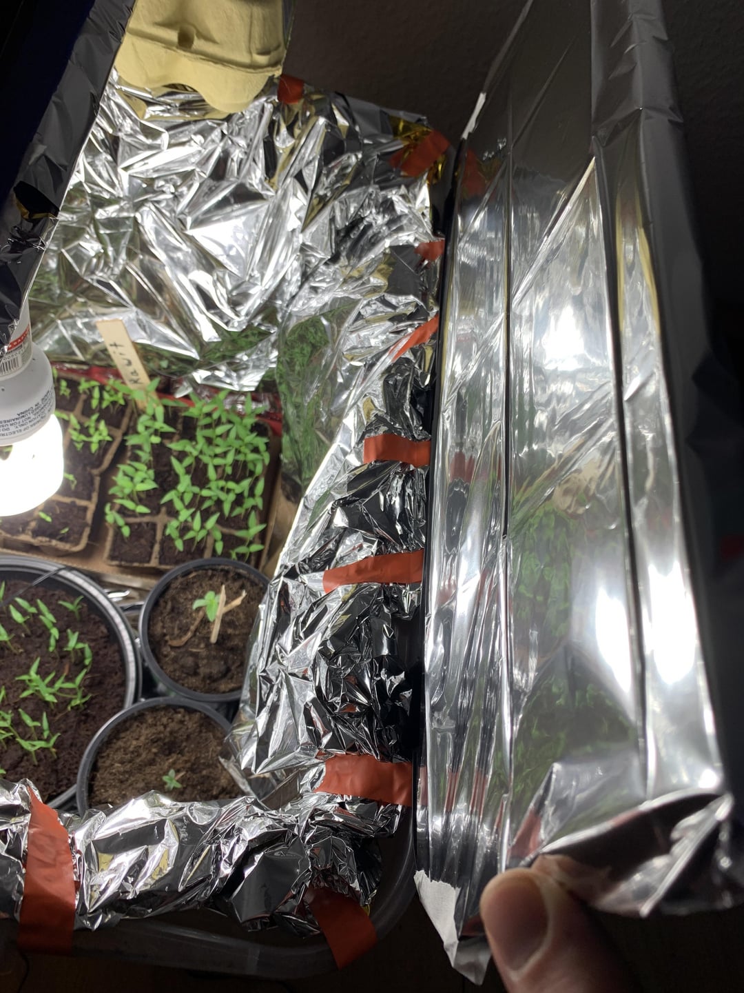 I used a rescue blanket, a old Plastic box and a natural light bulb from Exoterra. The temperature went up so I put a old eggcarton between the lid and the box so it can air out. The temp is now around 23,4 degrees Celsius. I water them regularly, sometimes twice a day (if the soil is to dry). Is this a good idea? The have been trying to get a little bit leggy so I thought it would be better to bring the light closer to them. Any suggestions are appreciated.