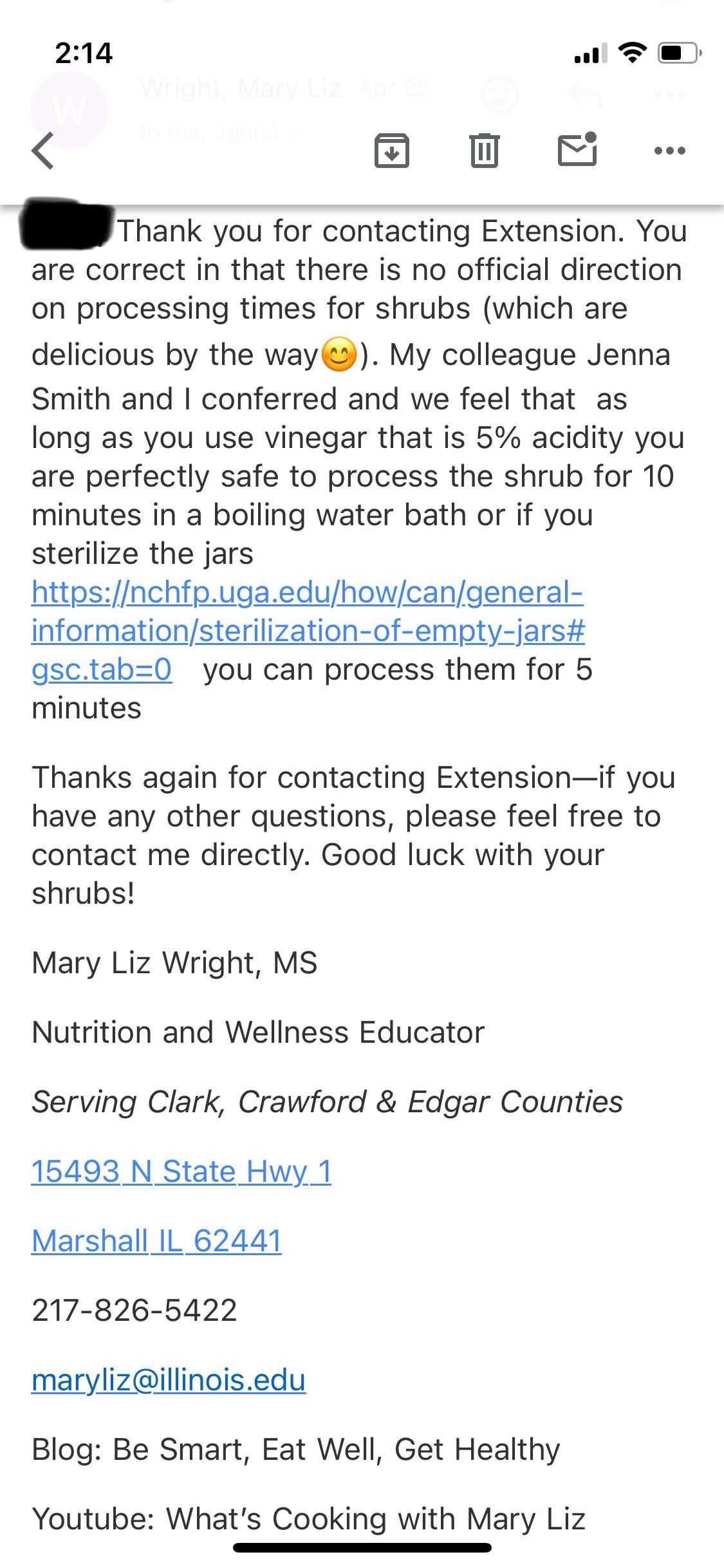 Thank you for contacting Extension. You are correct in that there is no official direction on processing times for shrubs (which are delicious by the way😊). My colleague Jenna Smith and I conferred and we feel that as long as you use vinegar that is 5% acidity you are perfectly safe to process the shrub for 10 minutes in a boiling water bath or if you sterilize the jars https://nchfp.uga.edu/how/can/general-information/sterilization-of-empty-jars#gsc.tab=0 you can process them for 5 minutes