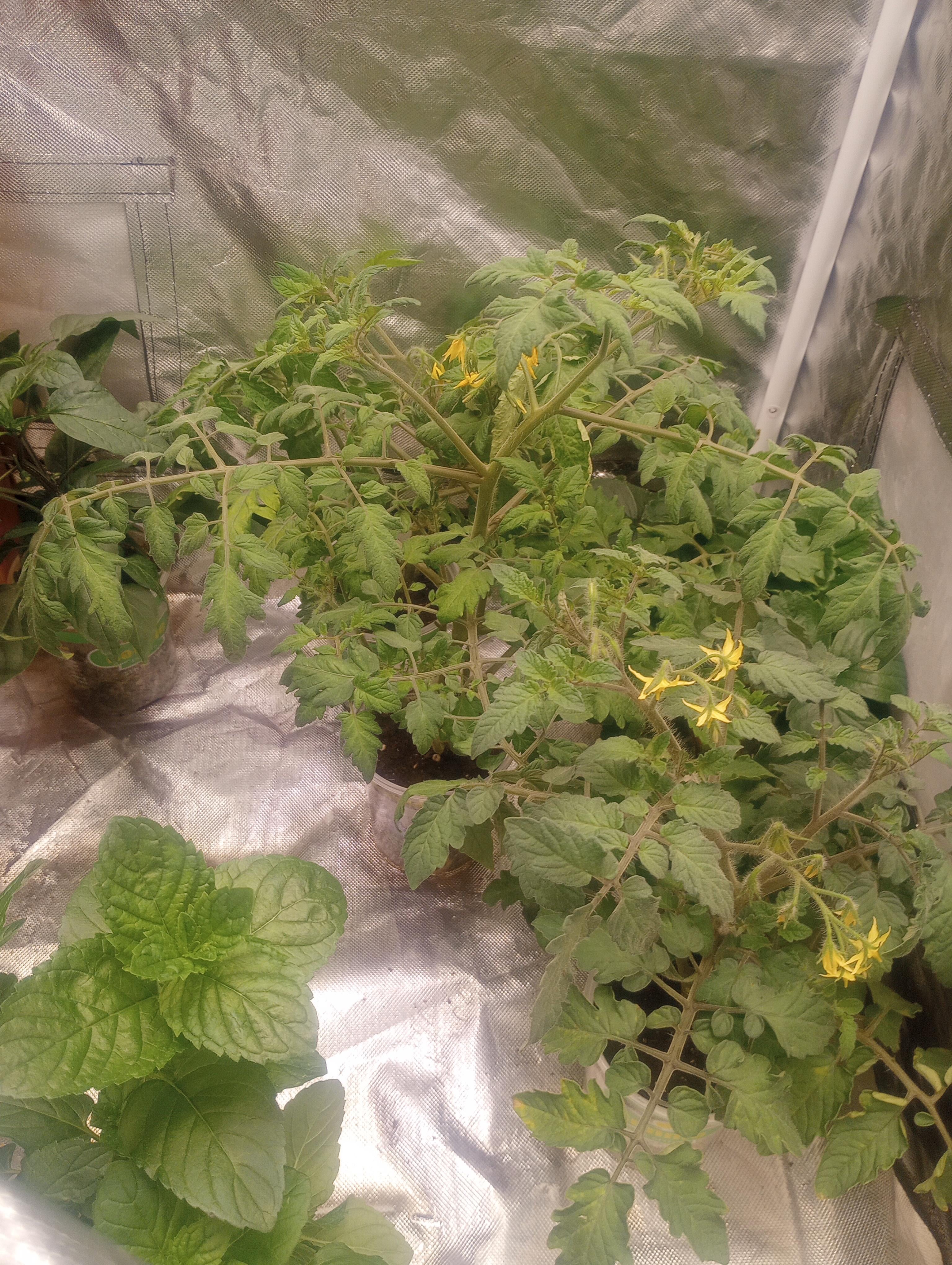 The tall one in the center is a Super Sweet 100 cherry tomato, behind it is a Juliet Roma Grape hybrid, and front right is a yellow pear cherry tomato plant. Back right, you can barely see a couple strawberry starts, back left is a Jalapeno, and the one poking up front left is a spearmint.