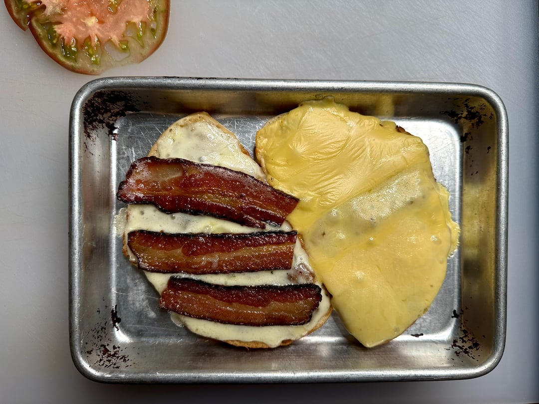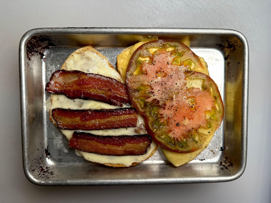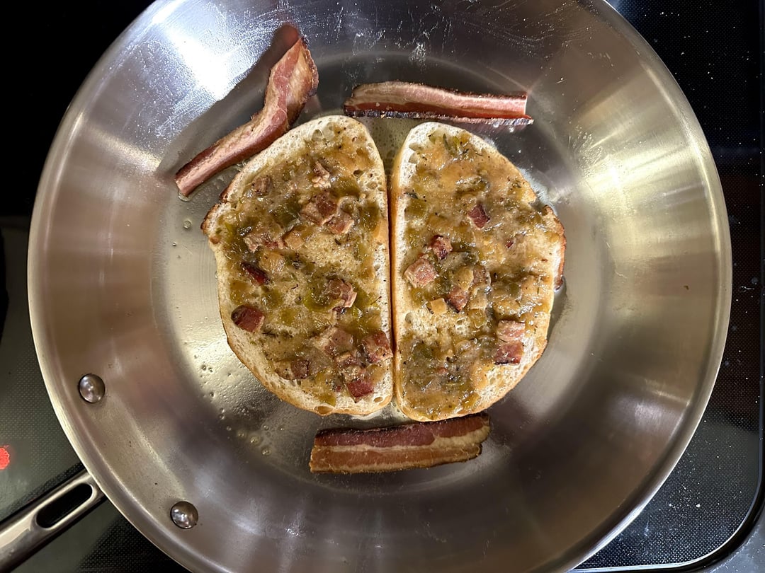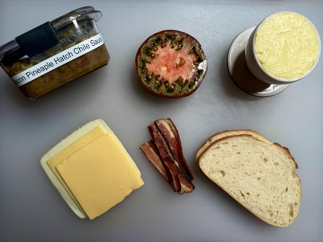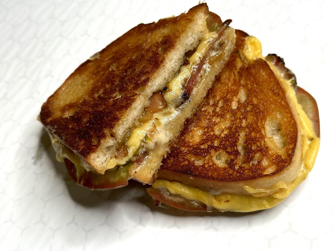 Italian country white with lots of Kerrygold salted butter and spread inside with a homemade bacon pineapple hatch chile sauce. I used Fontina, Gouda, and American cheese, bacon, tomato, and finished with hot honey after it spent a few minutes in the toaster oven to make sure it was all melty and gooey. Honestly, this was one of the tastiest sandwiches I’ve made, especially if you are a fan of sweet, savory, spicy, like I am!