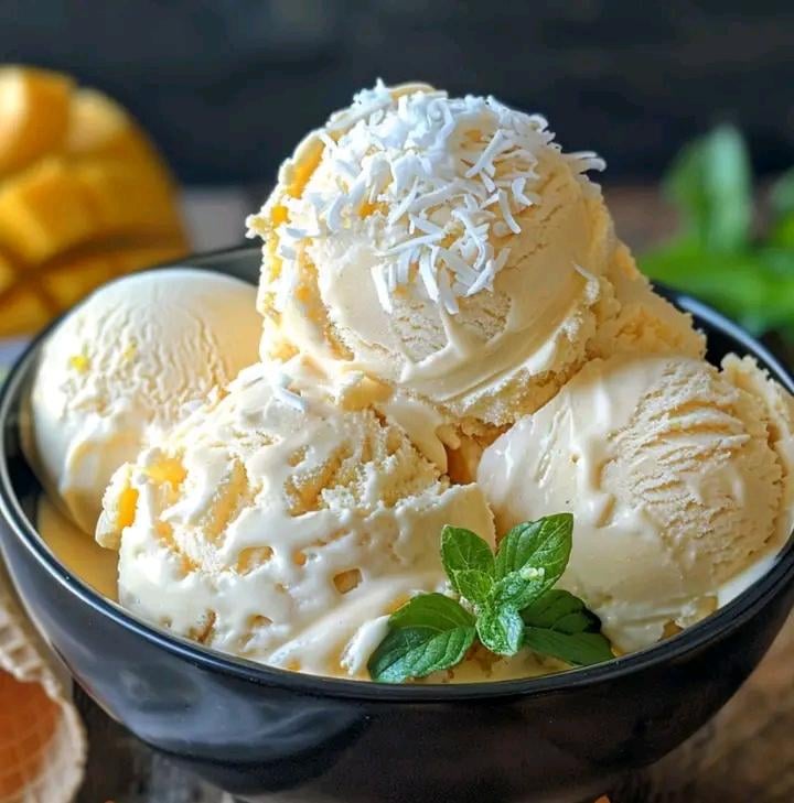 8. Scoop the ice cream into bowls or cones and garnish with additional shredded coconut or slices of fresh mango, if desired.
