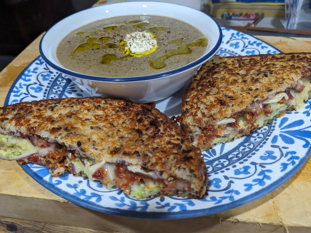 Sundried tomato, red onion, avocado and tripple cream brie toasted sandwich on soy and linseed bread served with a six kinds of mushroom soup garnished with finishing olive oil, sour cream and cracked black pepper.