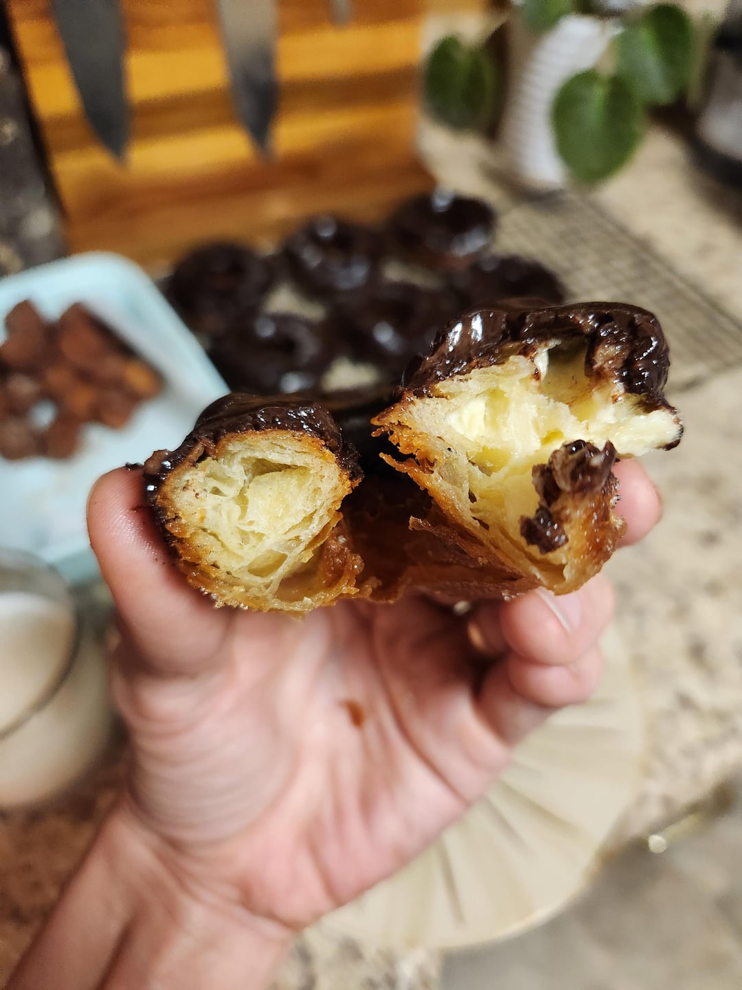 I live in a city with a chain of donut shops that make incredible, 100 layer croissant donuts. After doing some research, I found Dominique Ansel’s original recipe and method for this trademarked baked good. This is my first attempt at cronuts (and donuts, in general). The recipe for the main dough and process is linked below, and I’ll also link the recipes for the vanilla buttercream filling and chocolate ganache. Happy baking!