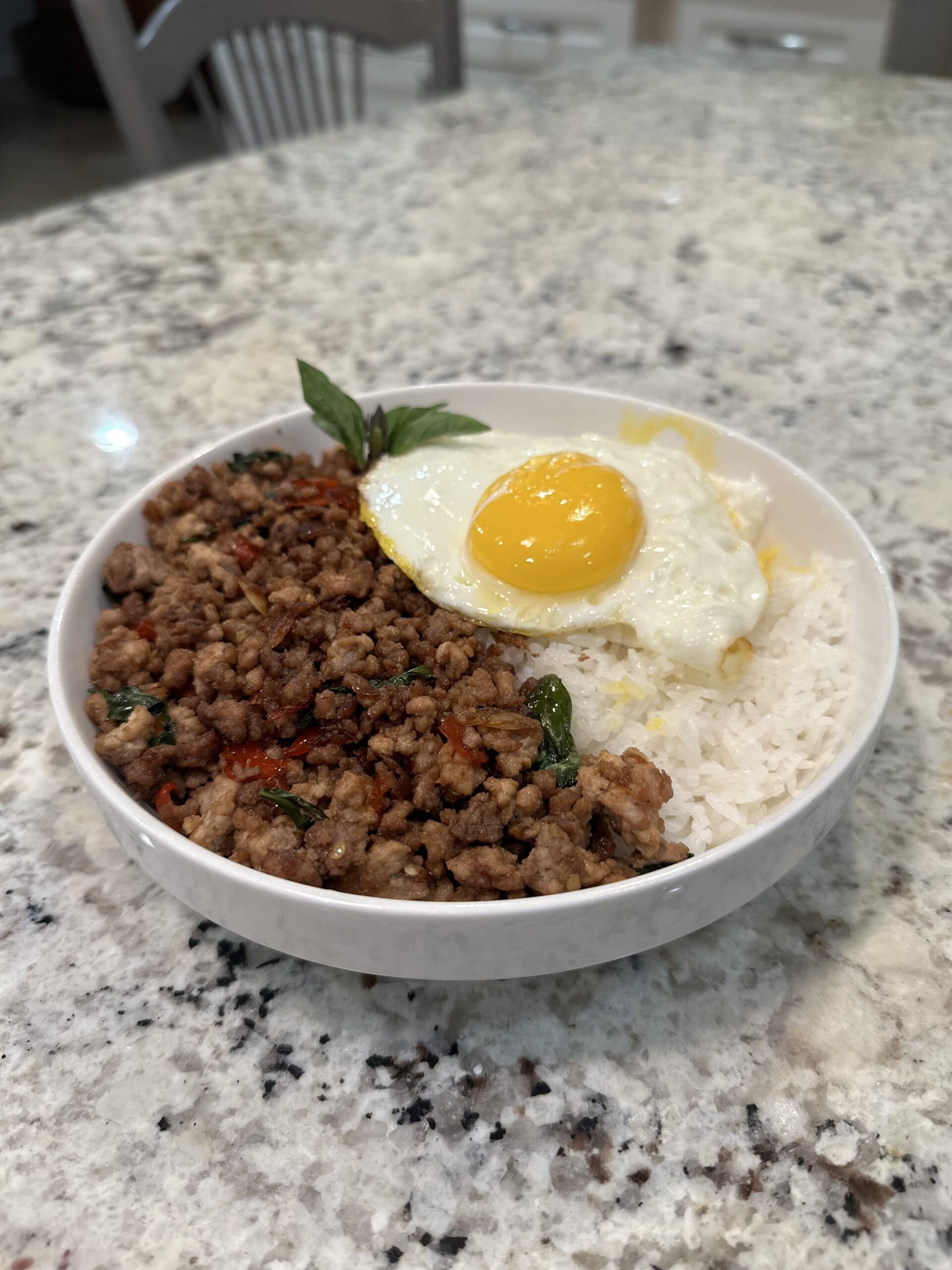 Stir fried pork with Thai chilis and Thai holy basil. Always served with a fried egg on top! Called “Pad Gra Prow” in Thai!by NoAdministration3979 Write A CommentYou must be logged in to post a comment.