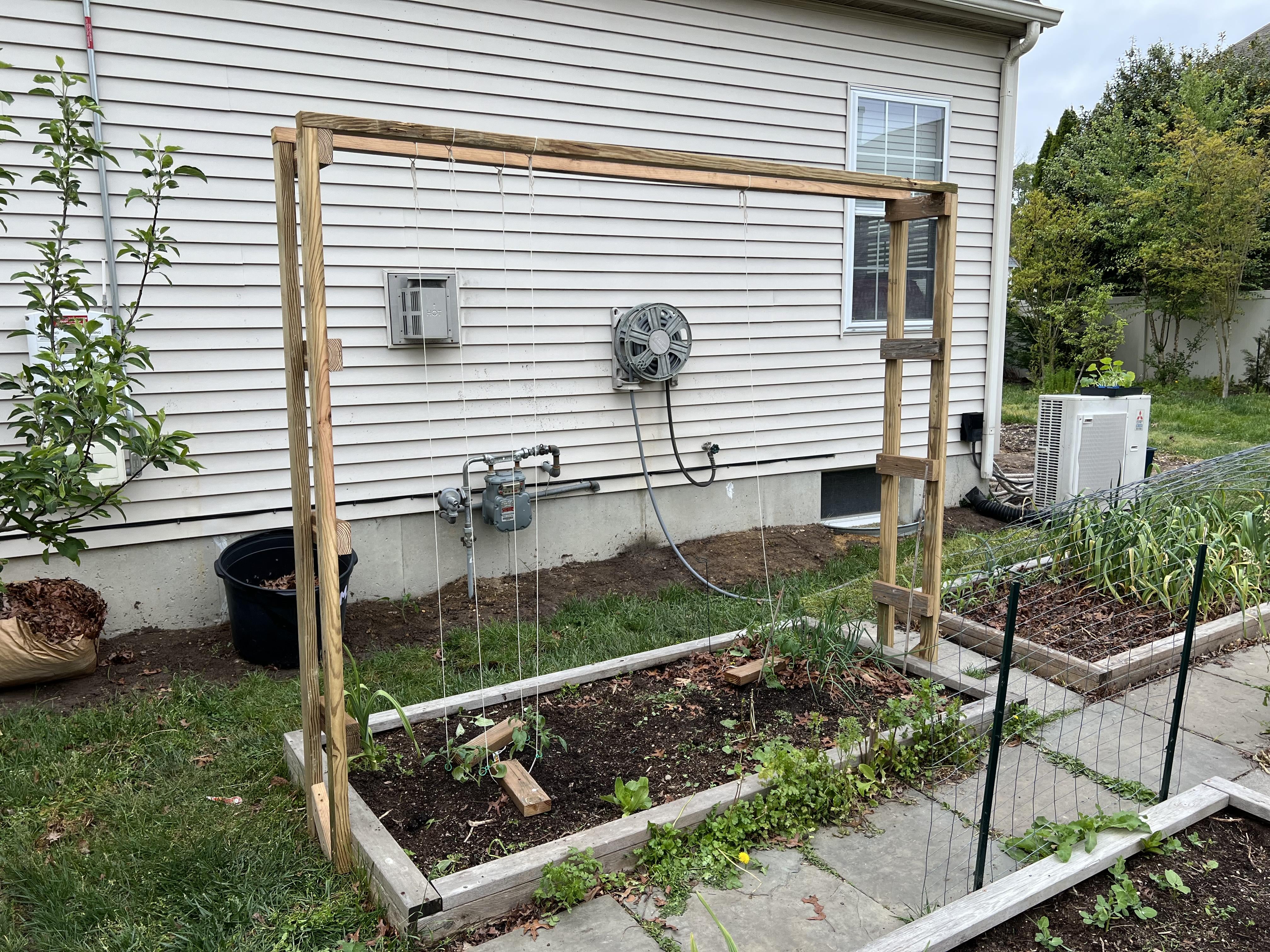 Made a tomato trellis this year with scrap wood. Ready for 7ft tall tomato plants!