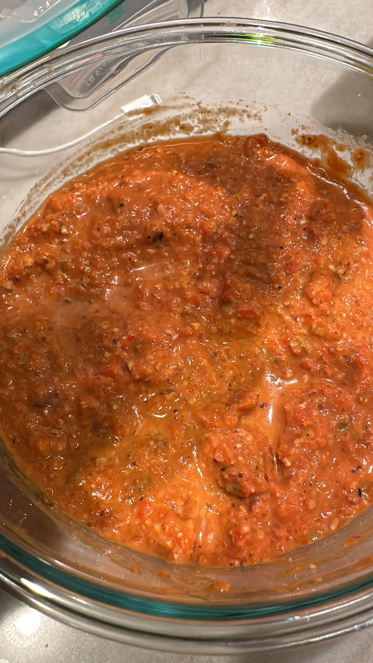 Roast up the red pepper. Place the red pepper in a bowl. Cover with plastic wrap for a few minutes. This traps the steam from the roasted pepper, making it easy to peel. When cool enough to handle, peel the pepper, remove the seeds and slice into small strips.