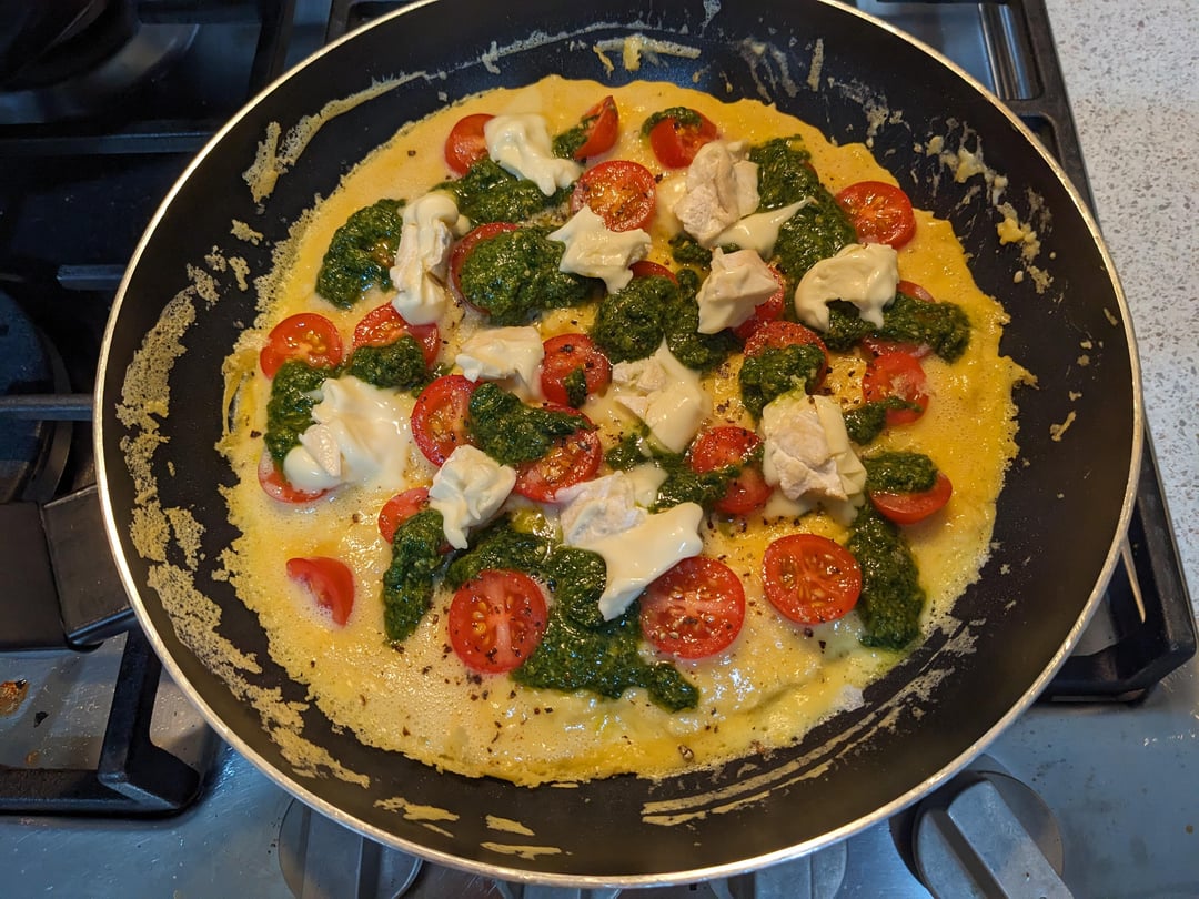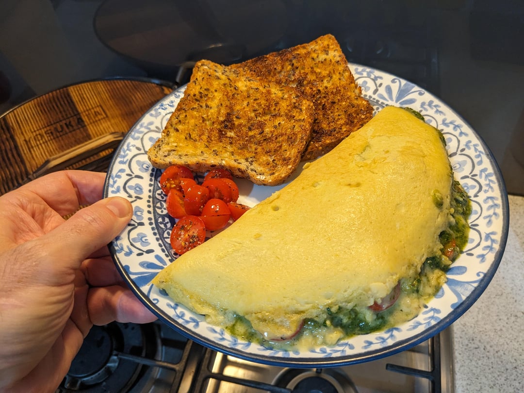 Omelette of cherry tomato, pesto and triple cream brie with the cherry tomatoes that didn’t fit in the omelette on the side and some soy and linseed toast.