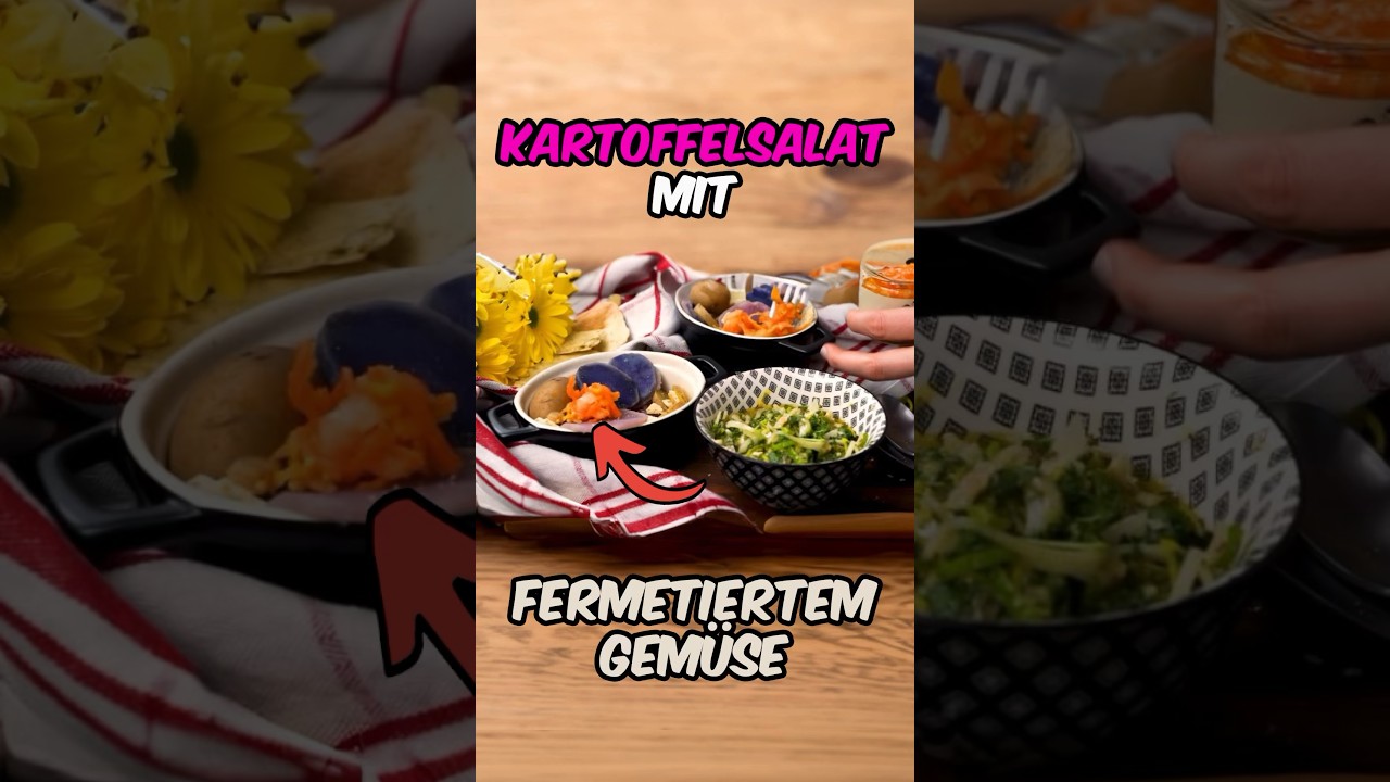 hier ist unser Kartoffelsalat mit unserer Geheimzutat fermentiertes Gemüse schäle deine Kartoffeln Schneide deine Kartoffeln in feine Scheiben koche sie bis sie gar sind und lasse sie abkühlen Schneide für das Dressing einen kleinen Teil deiner Lauchzwiebeln in ganz feine Streifen Schneide deine Zwiebel klein und hacke all die Kräuter deiner Wahl zu feinen Stücken wir haben Basilikum Estragon Rosmarin und tyymian verwendet gib deinen Lauch deine Zwiebel und deine Kräuter gemeinsam in eine Schale und Presse eine Knoblauchzehe dazu verfeinere dein Dressing mit zwei Löffeln scharfem Senft Olivenöl und schmecke das ganze mit Salz und Pfeffer ab richtte deinen Kartoffelsalat gemeinsam mit dem Ferment deiner Wahl an wir können fermentierte Karotten oder fermentierte Radieschen hier wunderbar empfehlen so verbindest du einen Klassiker der deutschen Küche mit wer Probiotik Power gib dein Dressing hinzu und jetzt heißt es nur noch hm genießen