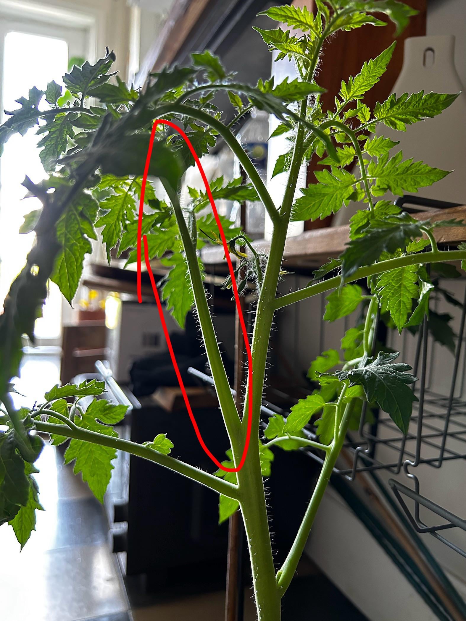 Yes the one you have circled would be considered the sucker if you are pruning all of the suckers. If you’re ever confused on which is the main growing stem look for which one has the flowers on it. Notice the main stem has a group of flowers just above the sucker you circled.