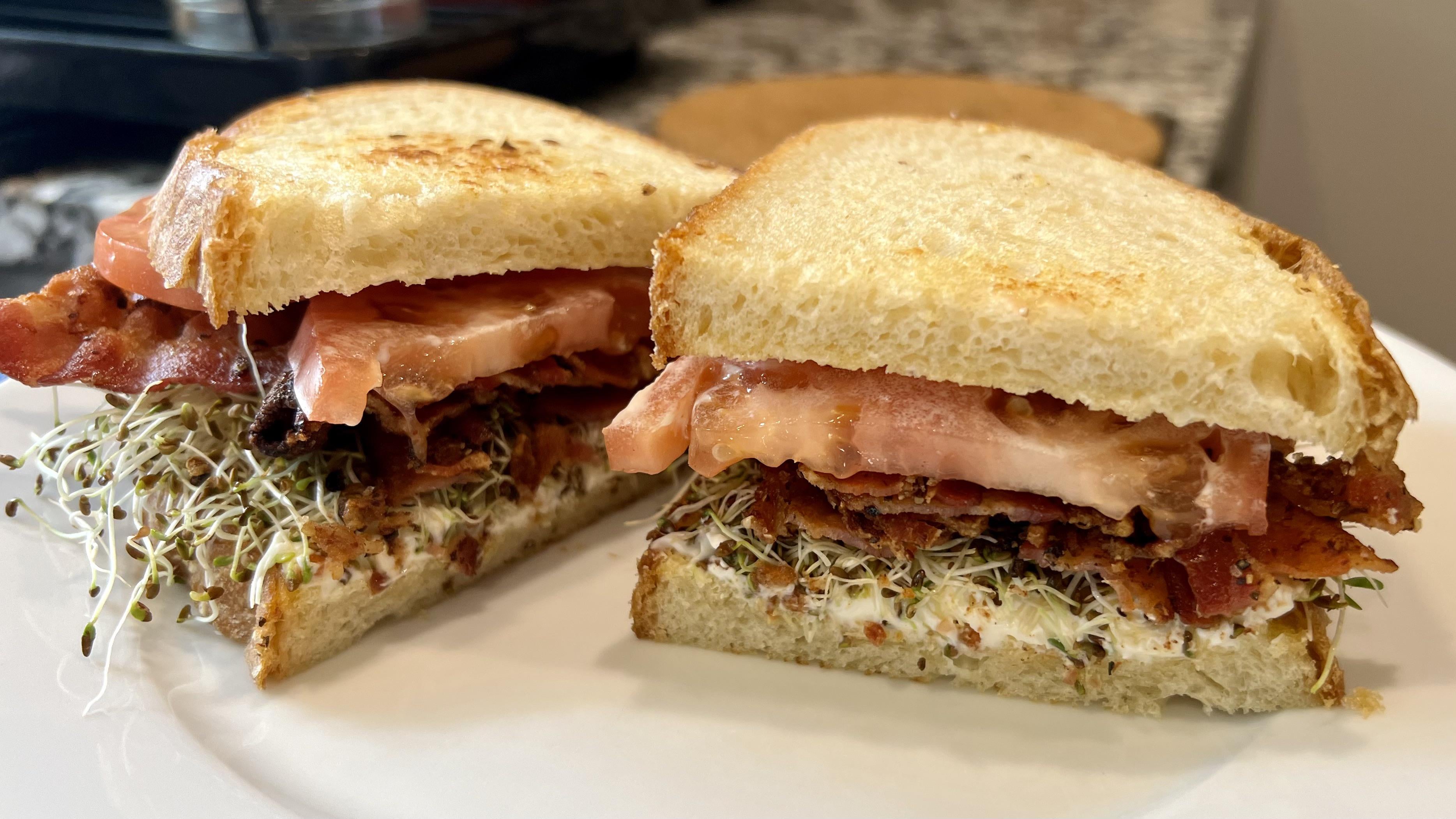 Instead of lettuce I used sprouts. On one side of the bread I gave it a nice layer of cream cheese schmear. Still used some mayo on the other slice. Rubbed the sourdough down with garlic and toasted it in a skillet with butter for the inside side. This was one of the best sandwiches I’ve ever eaten.