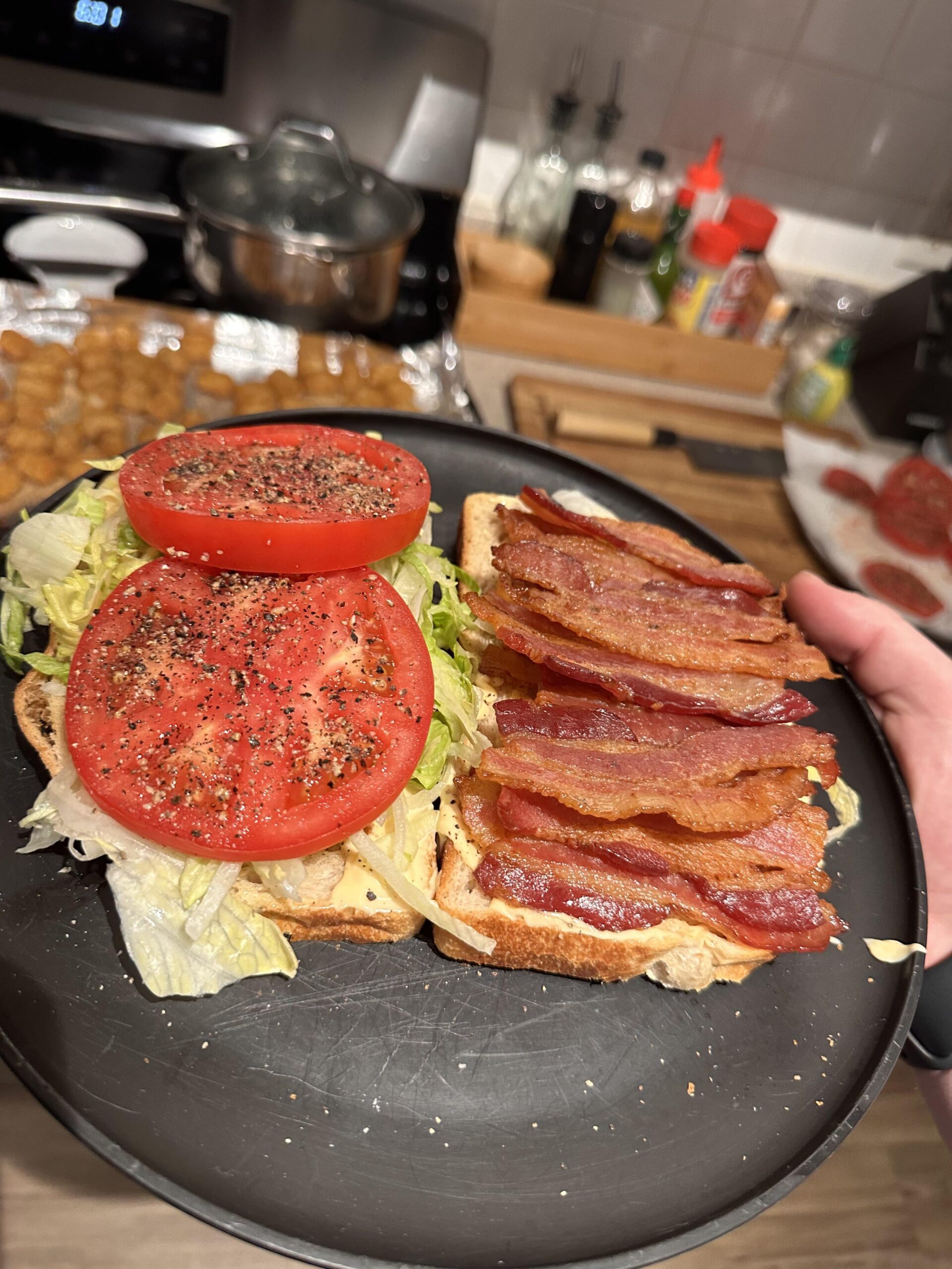 I like a BLT. Just one or two strips of bacon. Fucking love a LT. Double the tomatoes. Salt, pepper, and duke’s mayonnaise. Favorite sandwich. L is optional, and we usually use the whitest of white bread.