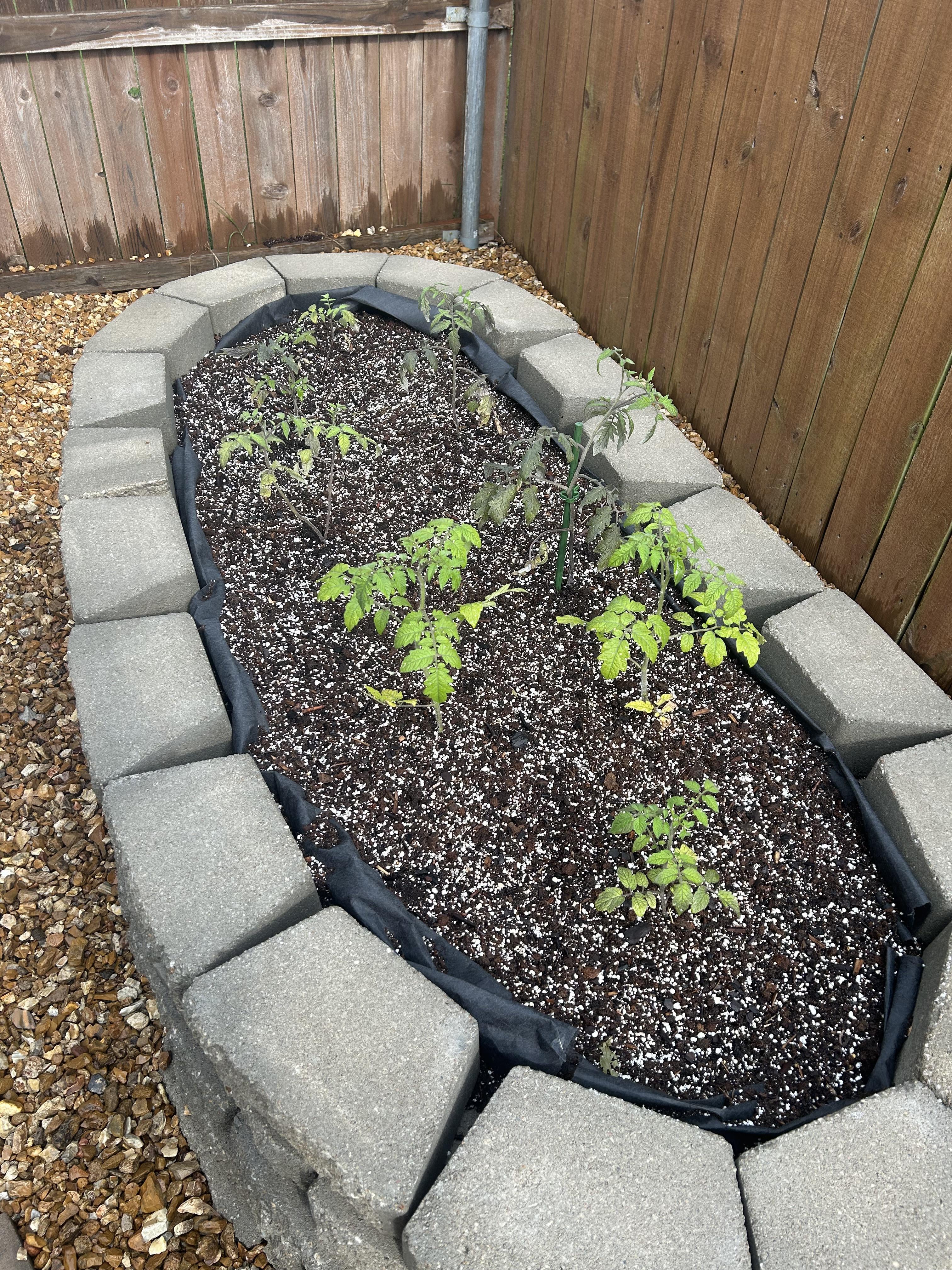 Looks pretty but not the most functional, need some trellis/bamboo or cages in there asap for support also before the roots grow out. You’ll risk damaging them later on.