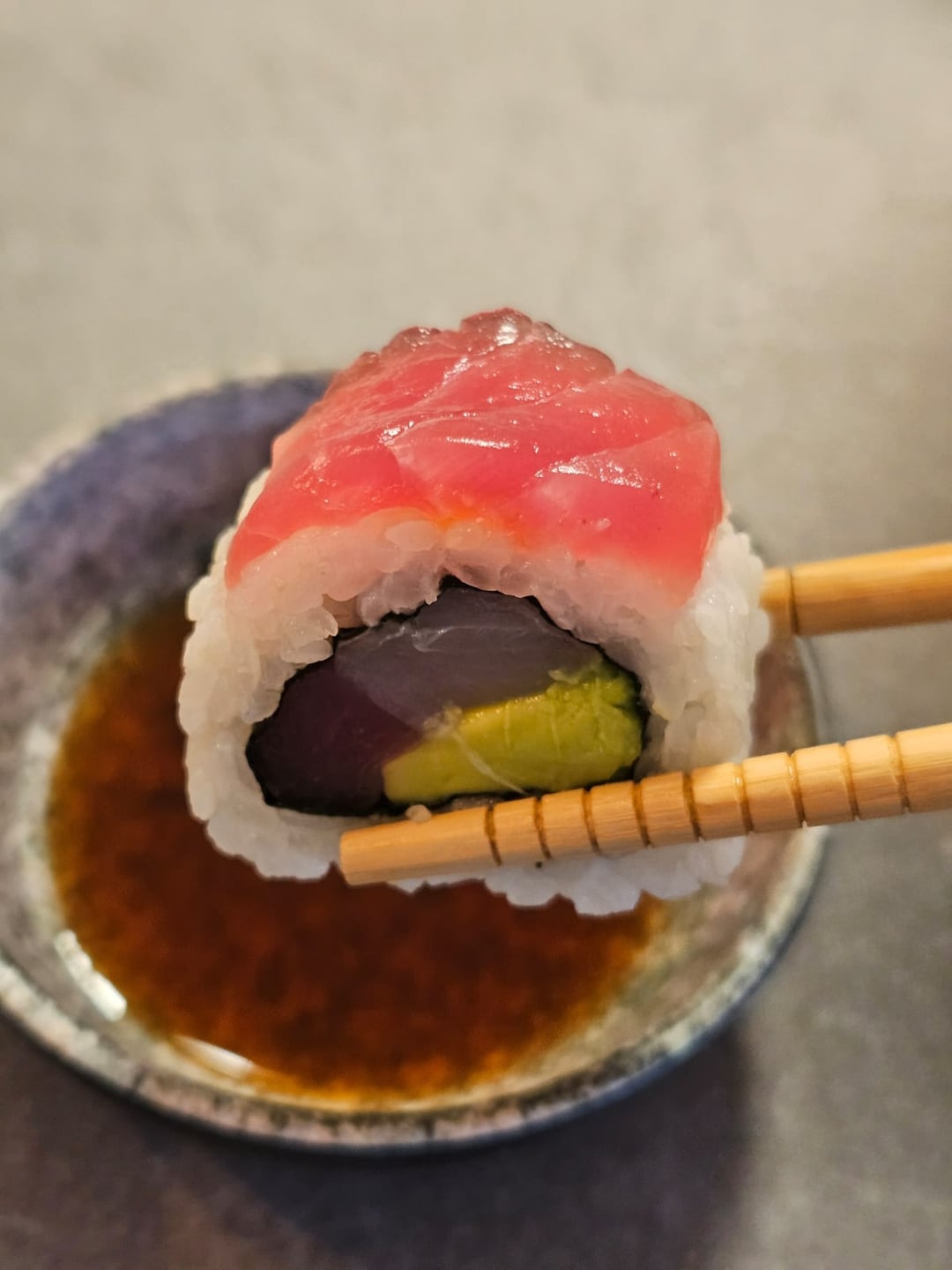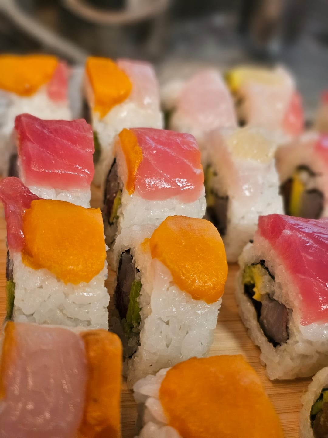 Individual rice grains look a little smushed. That may lead to a gummy texture, but it’s impossible to fully judge from a picture. I mainly see that in the 4th picture. But kudos for not drenching it in mayo! I would actually try this sushi! I’d give it a 36/44